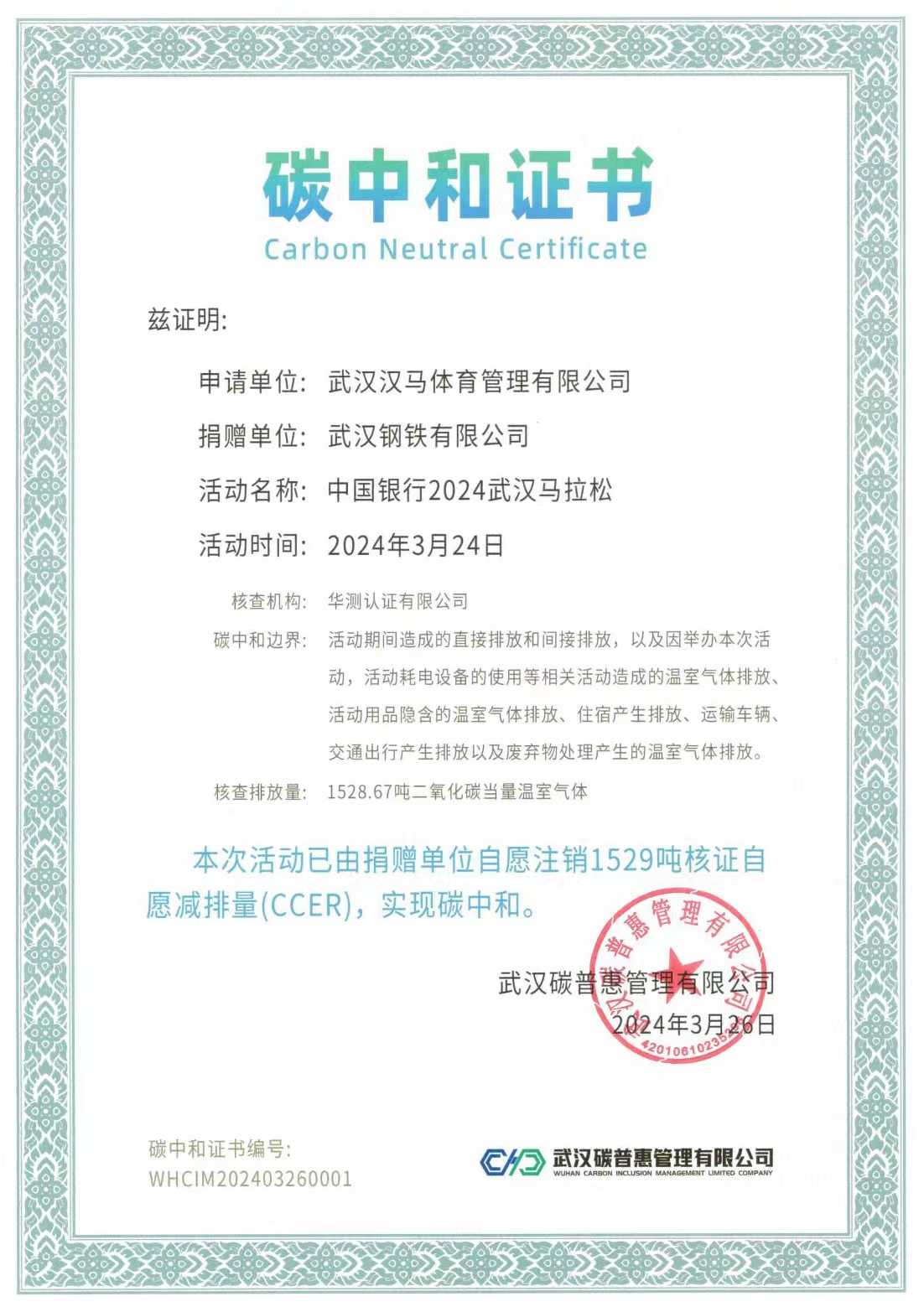 经华测认证有限公司核算,本次汉马赛事产生的碳排放量为1528.67吨。通过武汉钢铁有限公司捐赠核证自愿减排量和“武碳江湖”个人捐献碳普惠减排量的方式,对本次赛事产生的碳排放进行了碳中和。