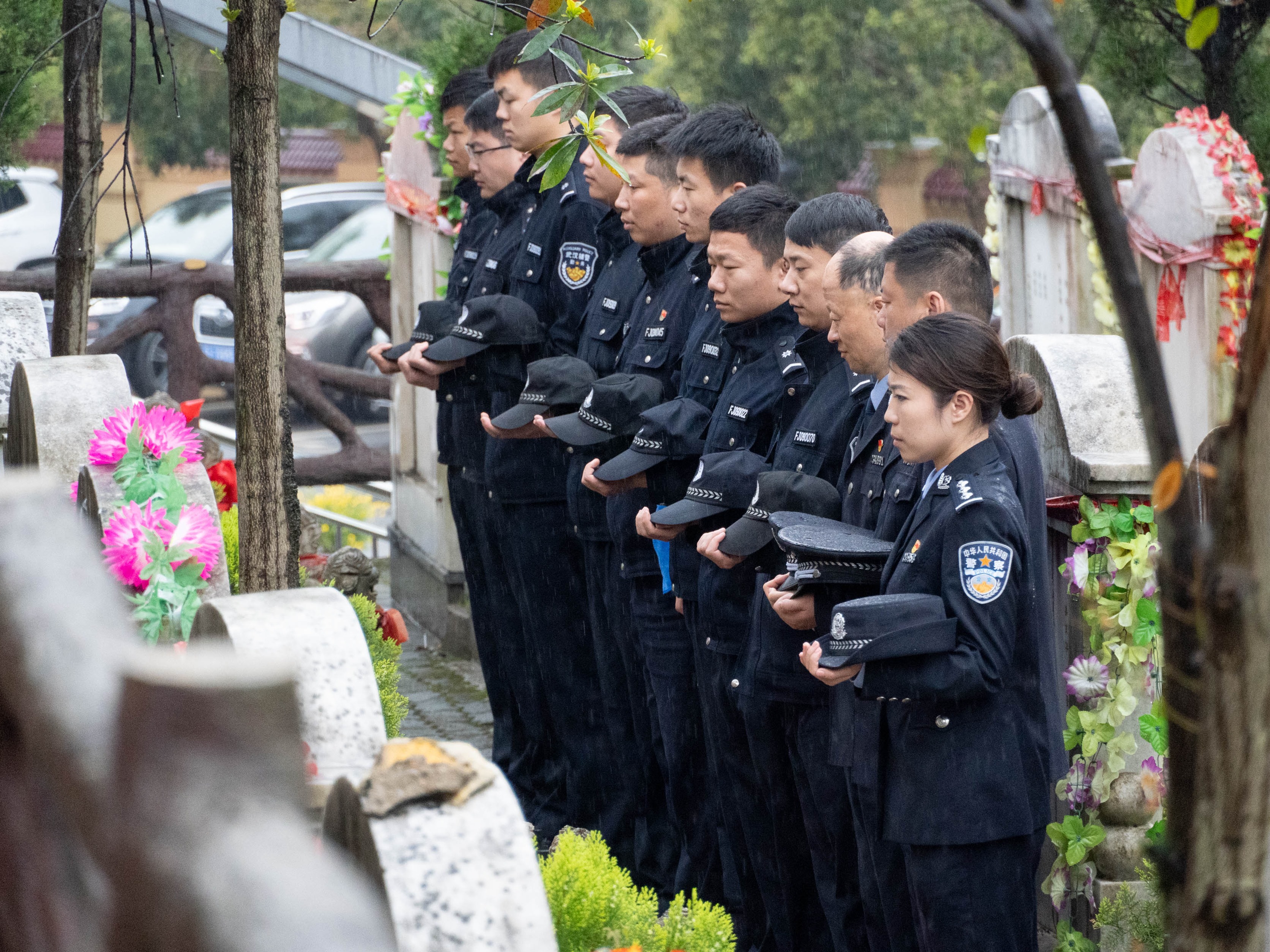 细雨纷纷,在英雄纪念广场的革命烈士纪念碑前,民警、辅警庄严伫立,向长眠于此的英烈们表达无限的哀思和敬意。