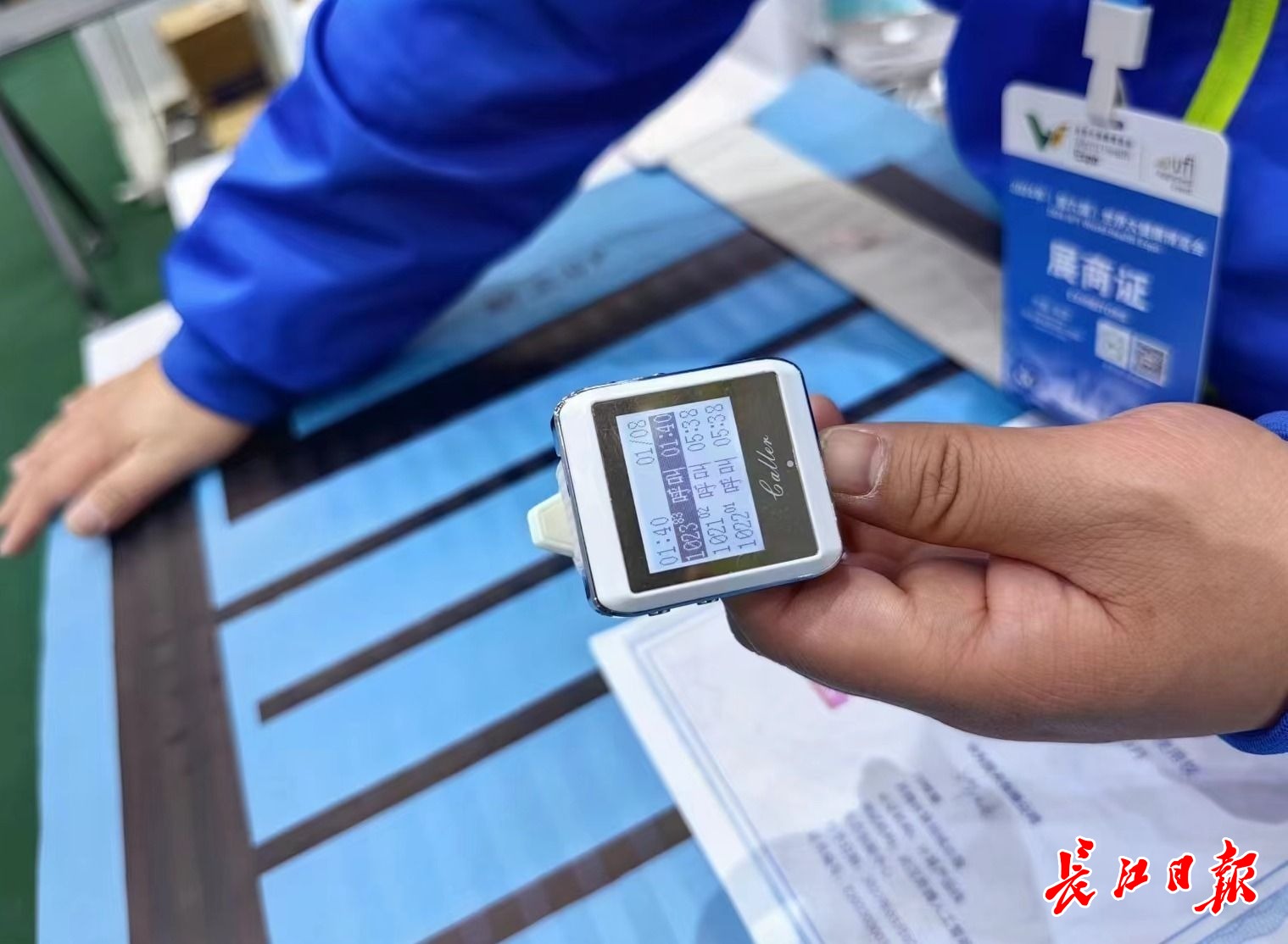 工作人员正在展示智能报警床垫。 记者杨帆 摄