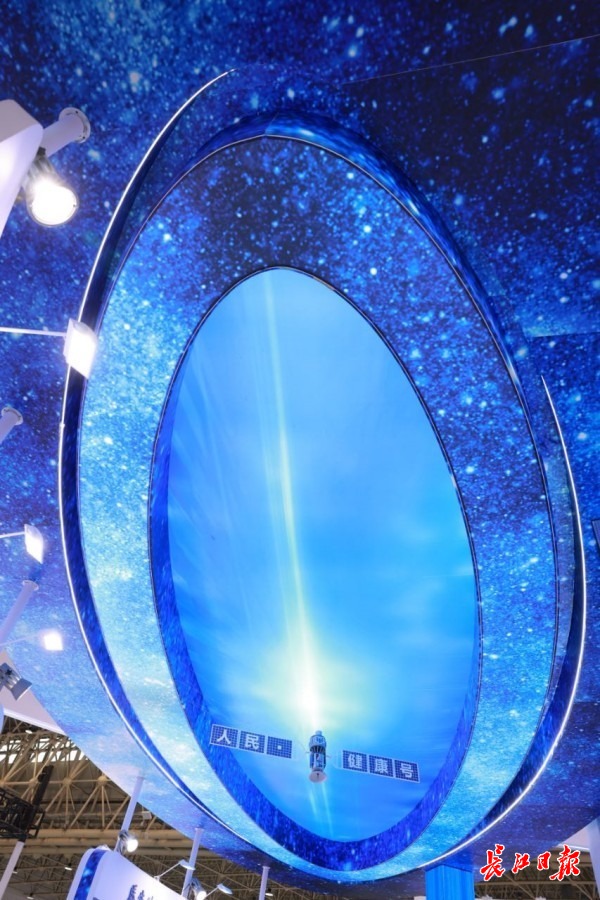 武汉大学人民医院展馆中央上空,一颗名为“武汉大学人民医院健康号”的卫星模型吸引了参观者抬头仰望。