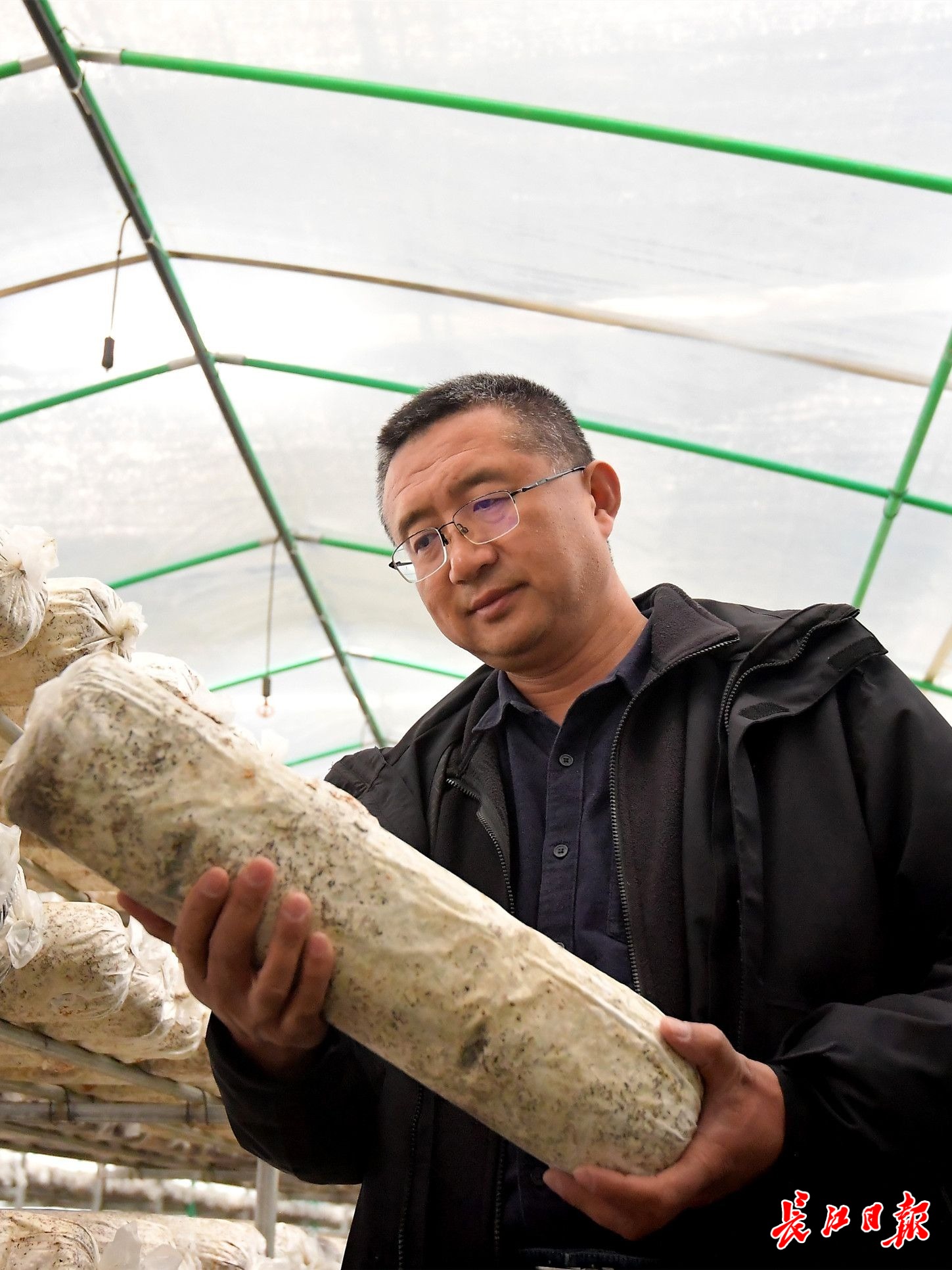 杜剑浩在种植大棚内观察蘑菇生长情况。记者刘斌 摄