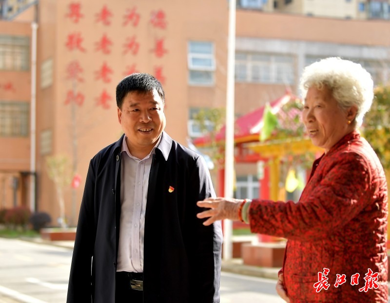 王寿元在新洲夕阳红养老院调研,和老人攀谈。