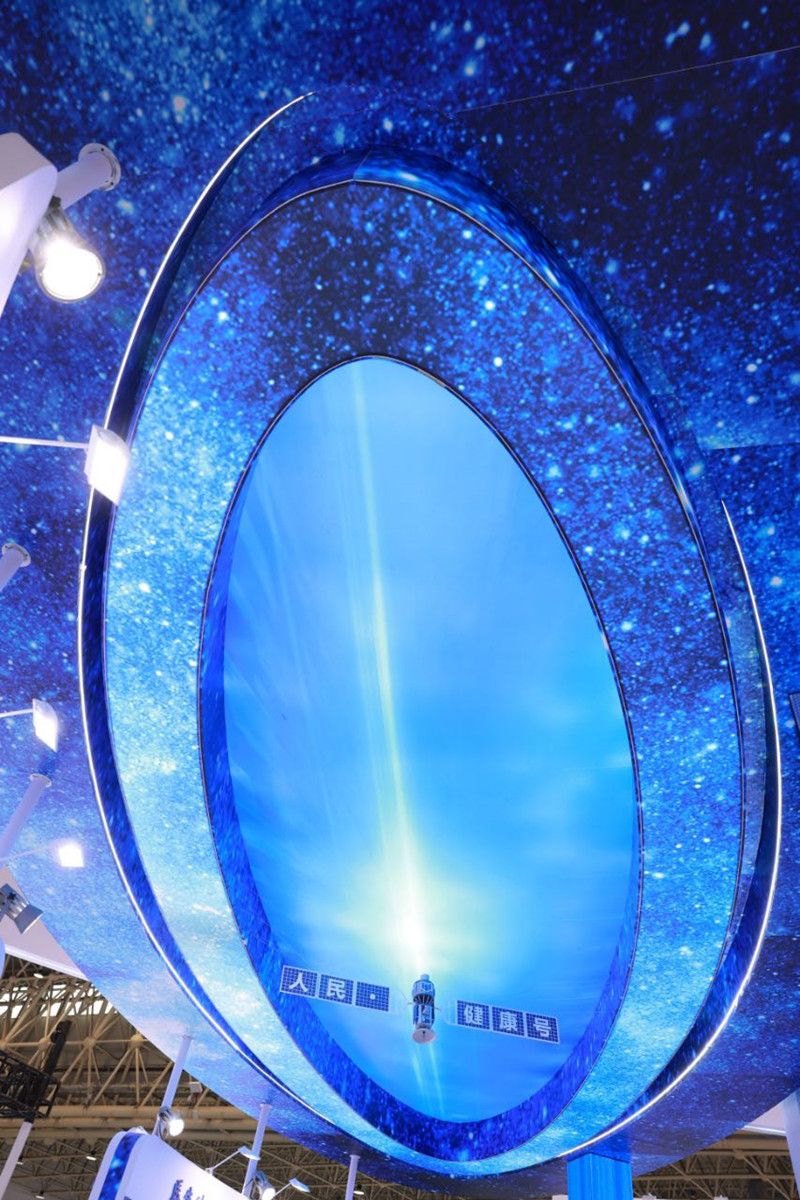 武汉大学人民医院展馆中央上空,一颗卫星模型吸引参观者抬头仰望。