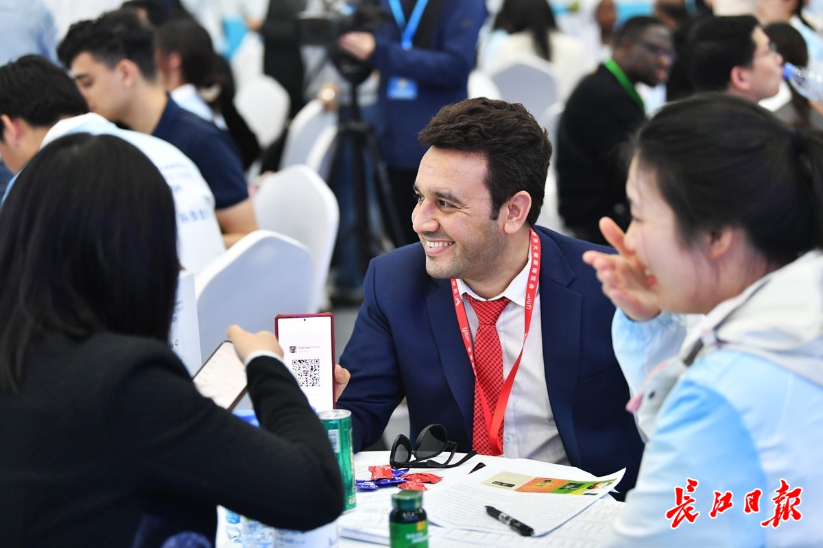 海外买家贸易配对会上,买卖双方拿出手机加微信。长江日报记者喻志勇 摄