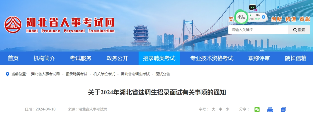 根据《2024年湖北省选调生招录公告》要求,现将2024年湖北省选调生招录面试有关事项通知如下: