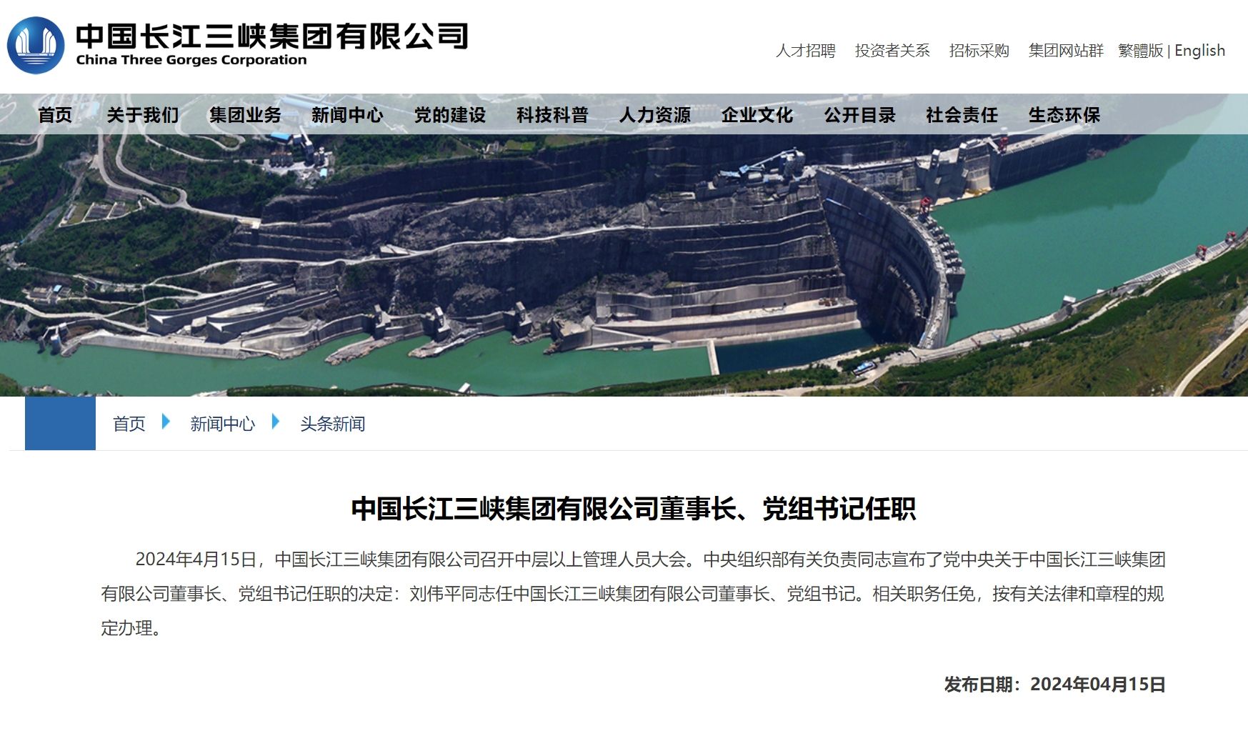 2024年4月15日,中国长江三峡集团有限公司召开中层以上管理人员大会。中央组织部有关负责同志宣布了党中央关于中国长江三峡集团有限公司董事长、党组书记任职的决定:刘伟平同志任中国长江三峡集团有限公司董事长、党组书记。相关职务任免,按有关法律和章程的规定办理。
