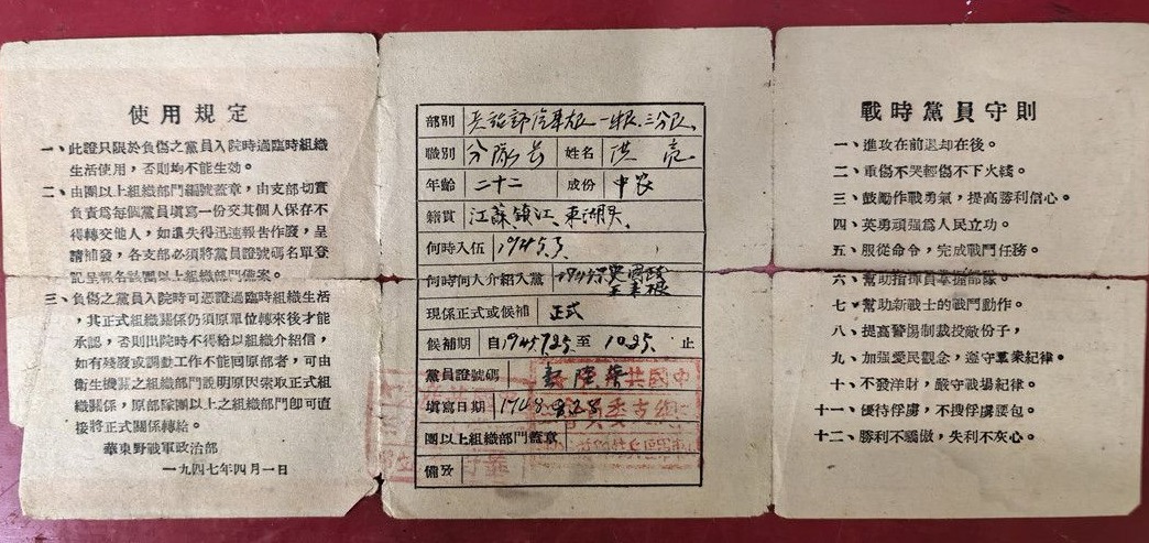 据史料记载,1947年华东战场上,解放战争正在激烈进行。为了避免伤员因部队转移失掉组织关系,华东野战军政治部印制了《中共临时党员证》,并作出规定:“此证只限于负伤之党员入院时过临时组织生活使用”,要求共产党员参加战斗时随身携带。