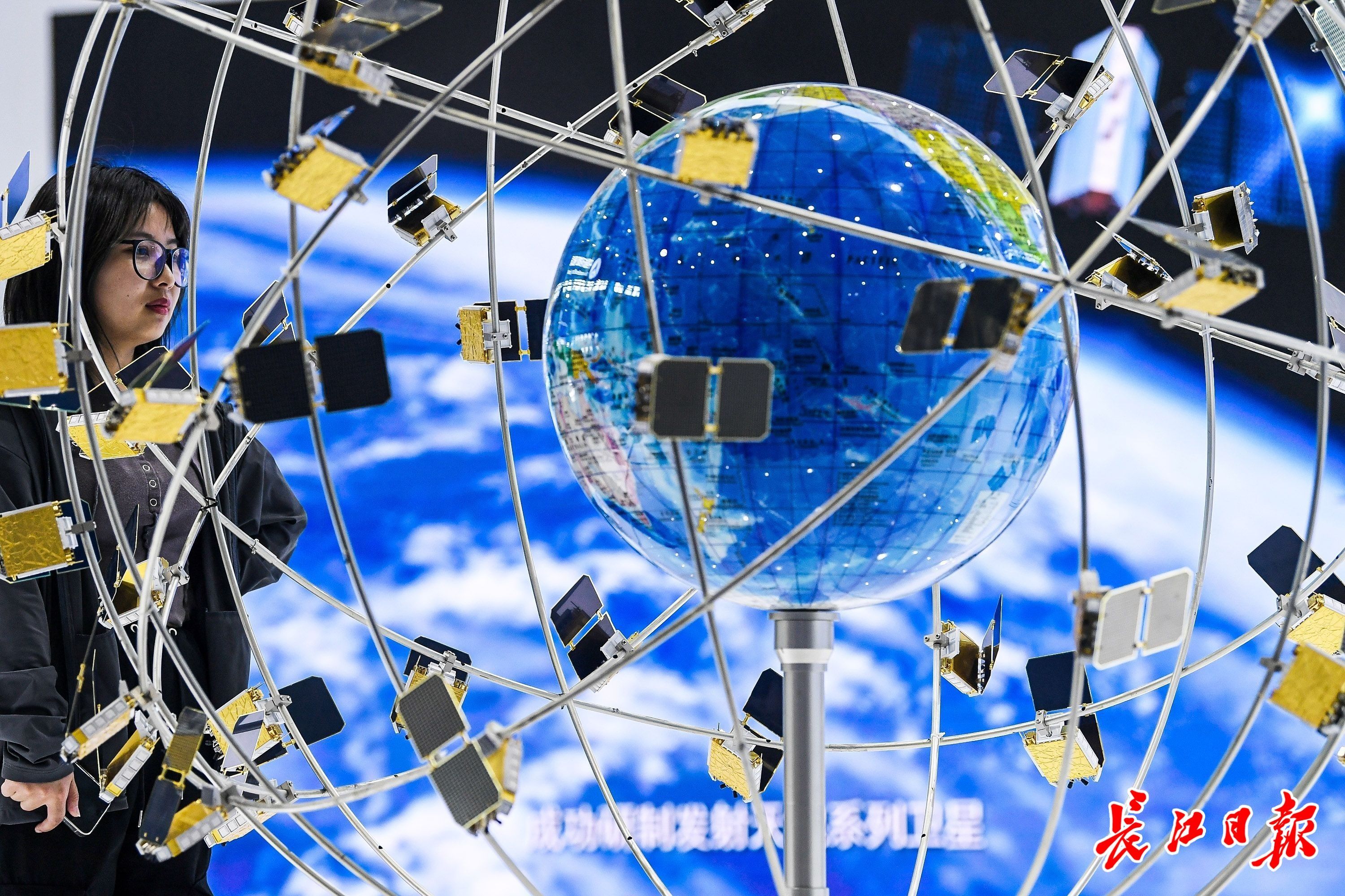4月24日,第九个“中国航天日”主场活动在武汉拉开帷幕,其中“航天科普系列展览”在武汉国际博览中心举办。图为展出的“天目一号”星座模型。 记者史伟 摄