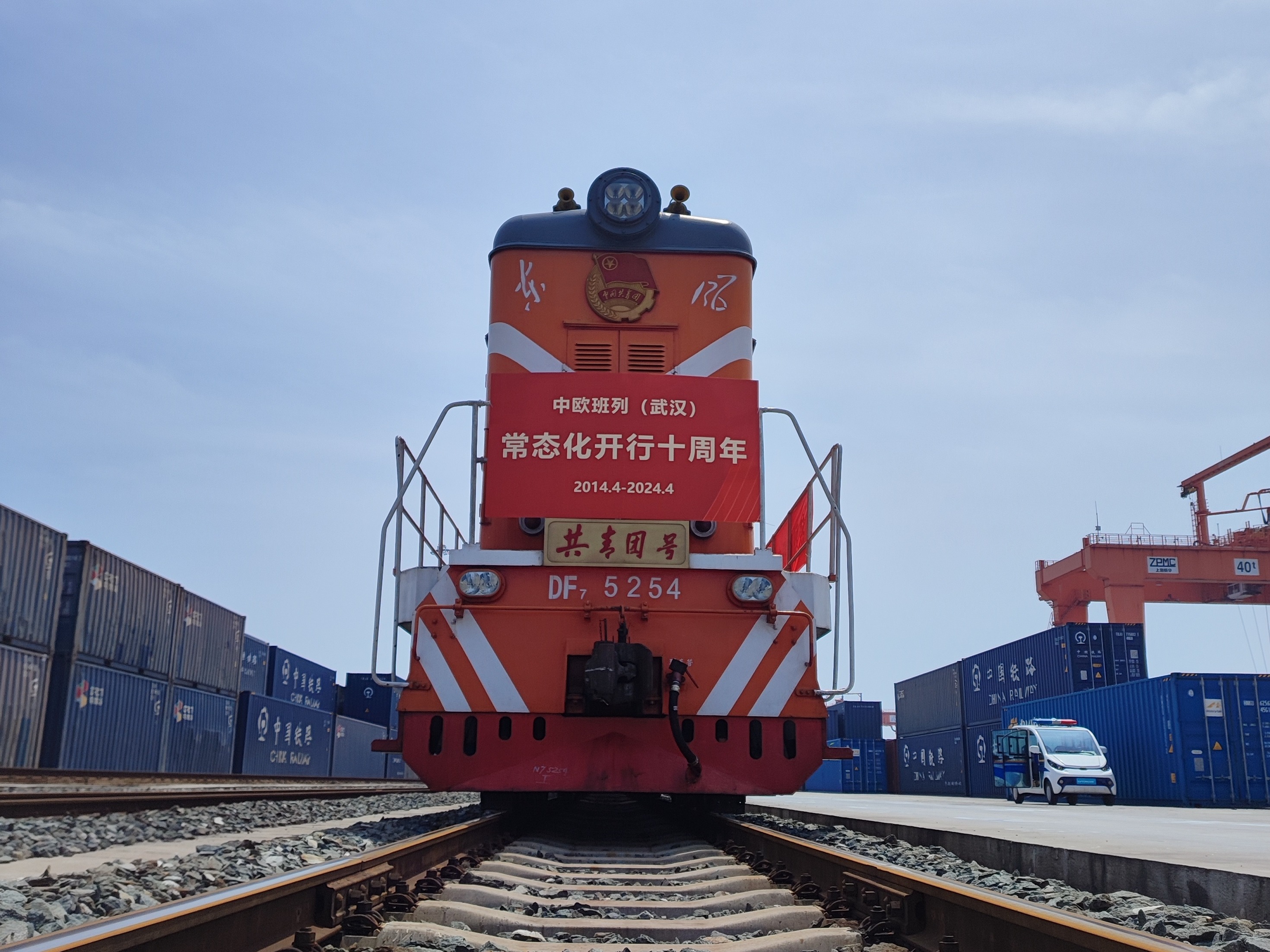 长江日报大武汉客户端4月24日讯(记者汪文汉 通讯员徐晨)4月23日上午,随着一声汽笛长鸣,满载着空调、服装、日用品等货物的中欧班列(武汉)从中铁联集武汉中心站一路向西开往欧洲。10年前的这一天,中欧班列(武汉)开始常态化运营。