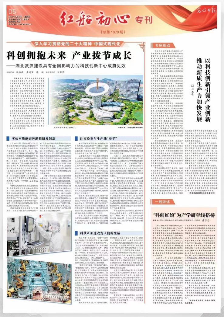 4月25日,《光明日报》“红船初心”专刊刊发整版报道《科创拥抱未来,产业拔节成长——湖北武汉建设具有全国影响力的科技创新中心成势见效》,关注湖北以武汉东湖高新区为试点,推出以“用”为导向的科创供应链平台,推动实验室与生产线“牵手”的创新实践。