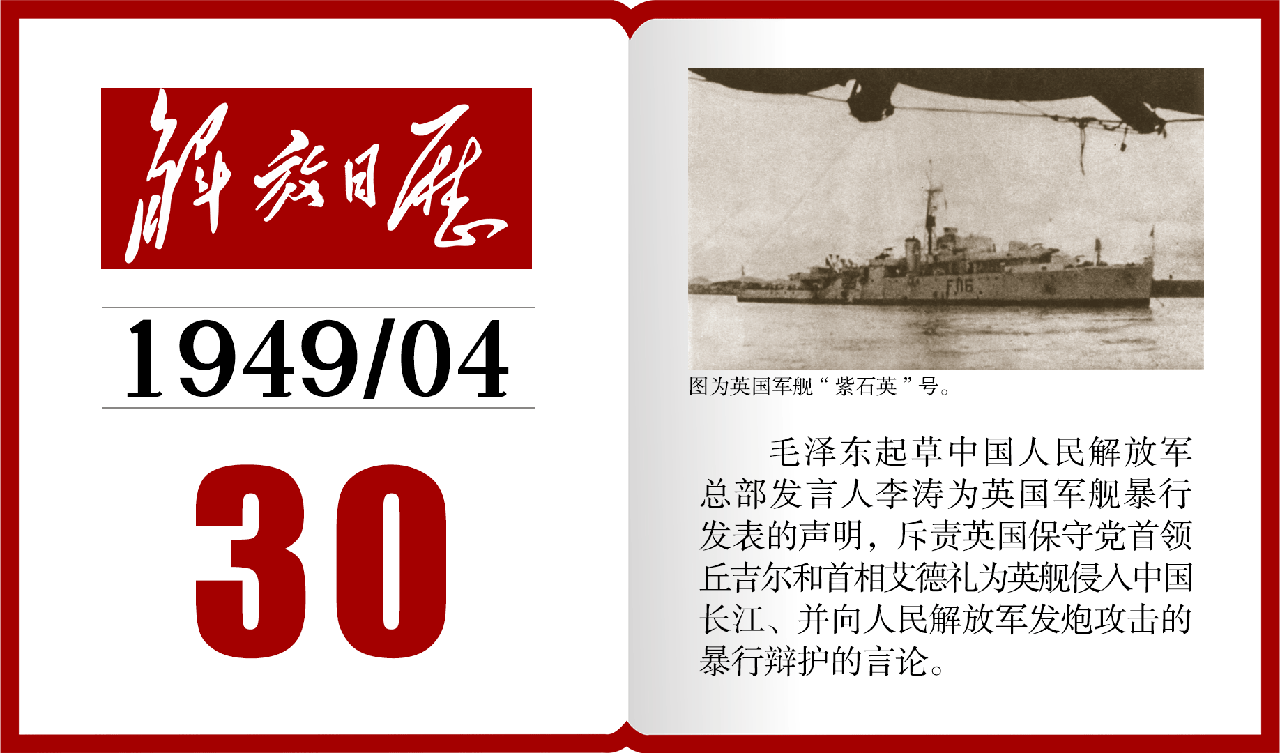1949年的今天,毛泽东起草中国人民解放军总部发言人李涛为英国军舰暴行发表的声明丨解放日历 ©原创 2024-04-30 10:18 0 图片来源:中央档案馆 整理:张颖 设计:陈昌 制作:张莉 【编辑:邓腊秀】