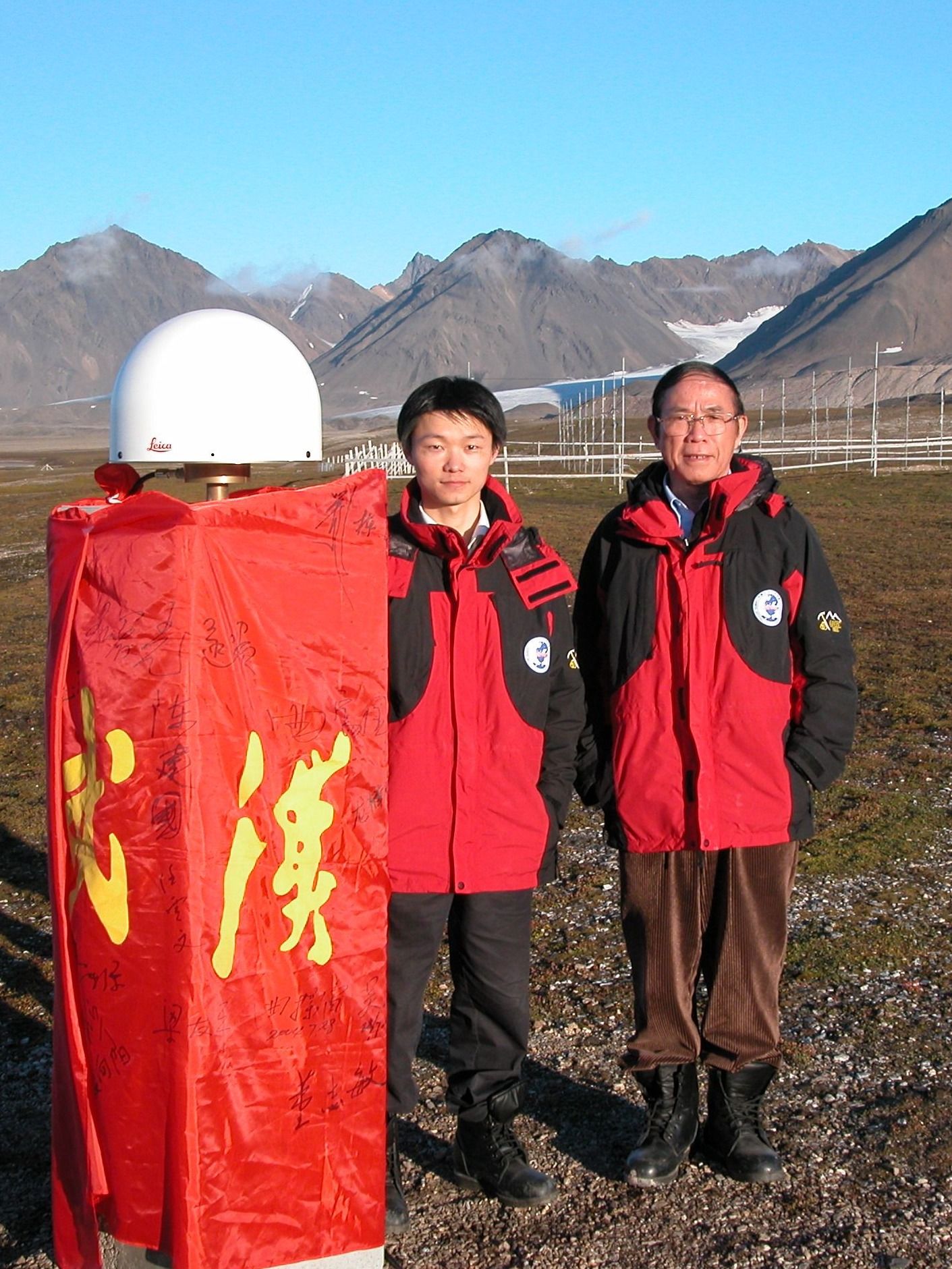 武汉大学中国南极测绘研究中心艾松涛教授(左)和导师鄂栋臣(右)参与北极黄河站建站,并建成中国第一个北极卫星跟踪站。