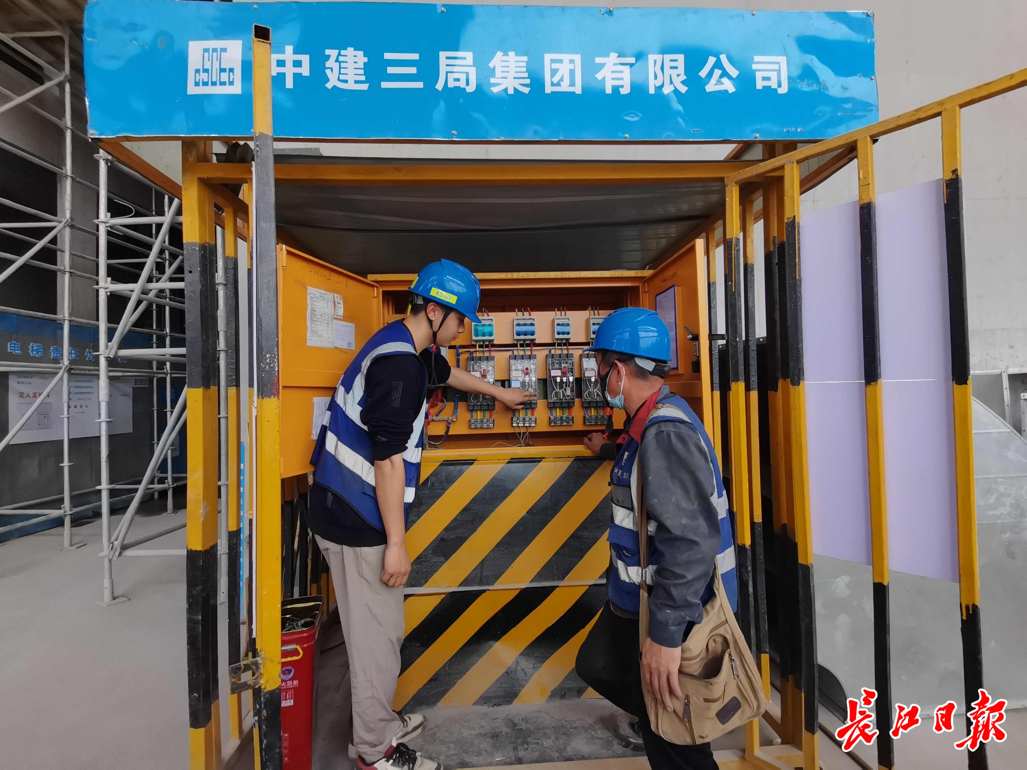 电工杜子恒(左)和金玉黔(右)在泰康金融中心项目巡查、维护配电箱。记者万凌 摄