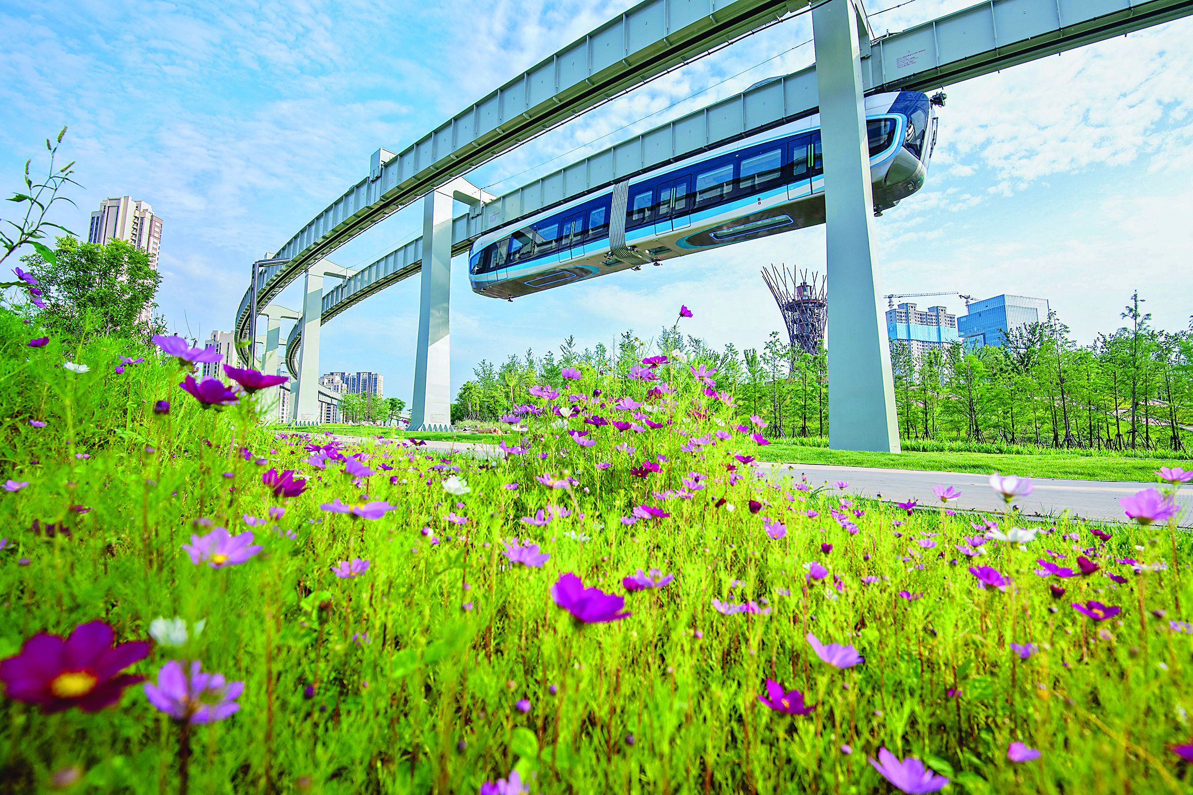 5月7日国务院新闻办公室举行的“推动高质量发展”主题新闻发布会聚焦湖北,现场中外记者领到一份湖北简介小折页,打开印着黄鹤楼的封面,映入眼帘的就是我国首条空中悬挂式列车“光谷光子号”。