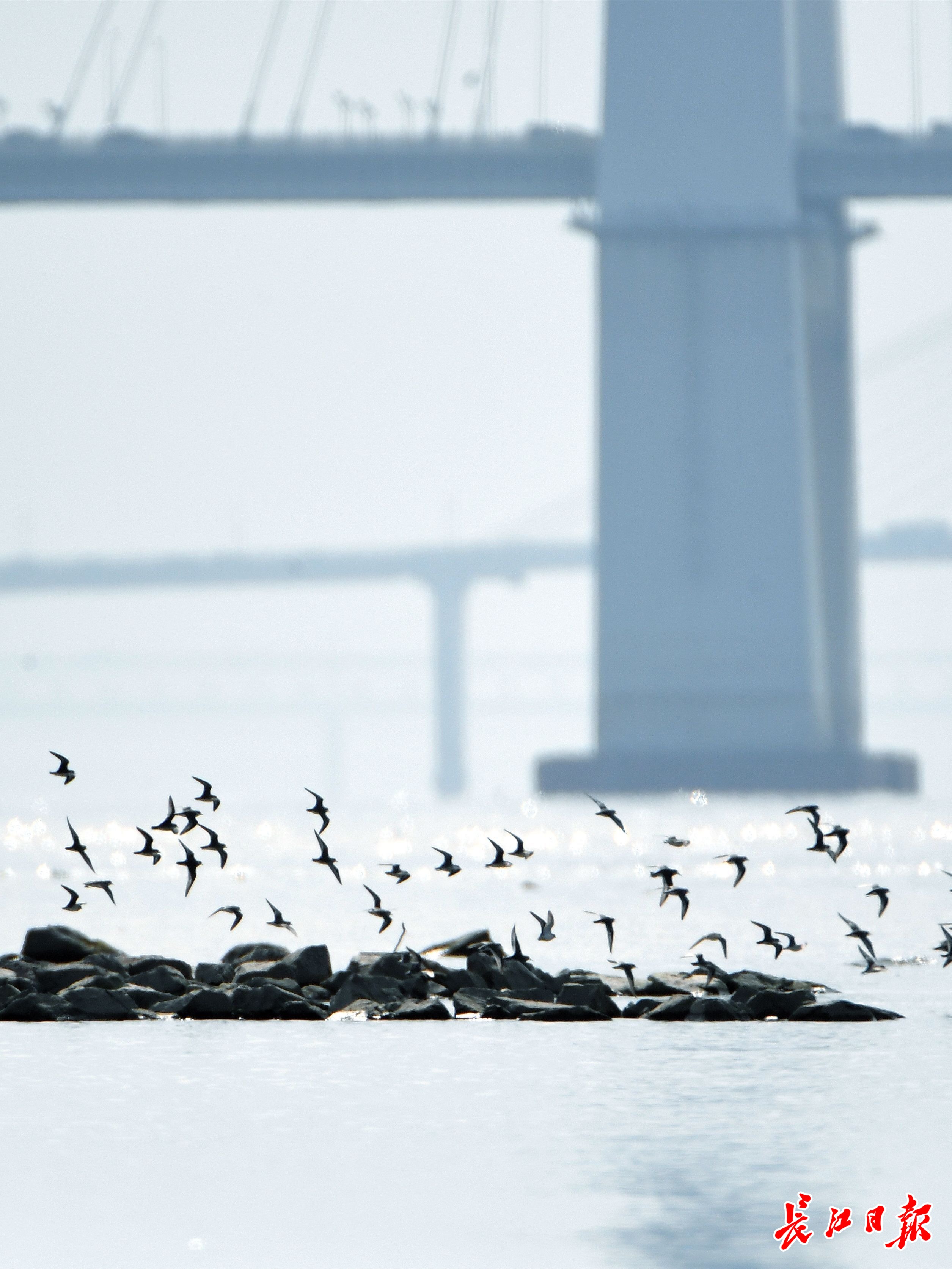 一群滨鹬在天兴洲江面飞越。长江日报记者 高勇 摄