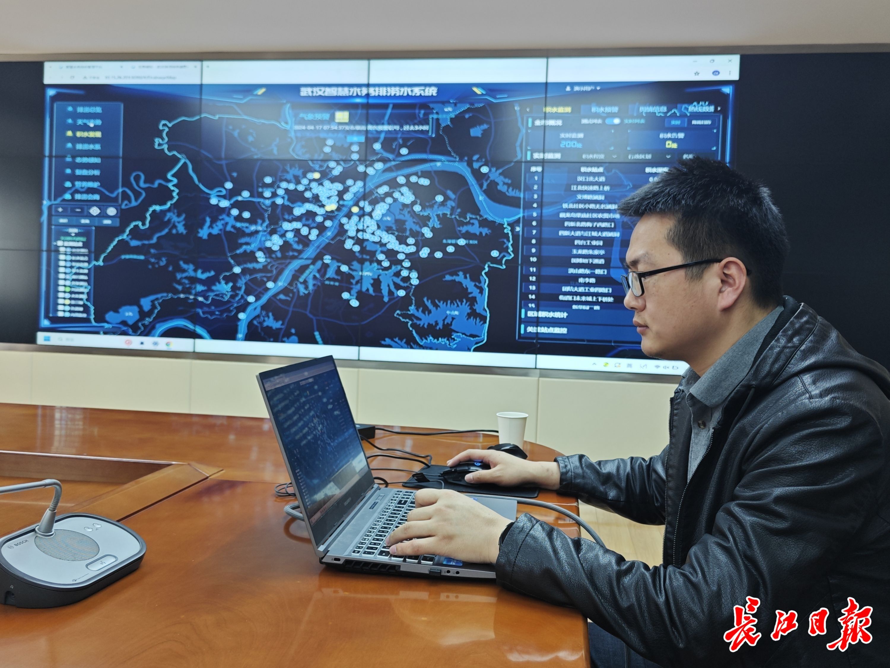 武汉市水务防汛信息中心工作人员在智慧水务“云图”上“盯着天,看着地,管着人”。实习生陈星雨 摄