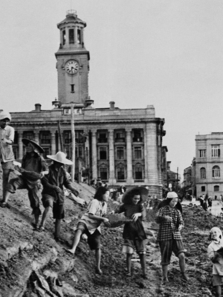 1954年夏,武汉30万军民众志成城,抵御百年未遇的特大洪水,这是他们在江汉关筑堤防汛。(AI修复)