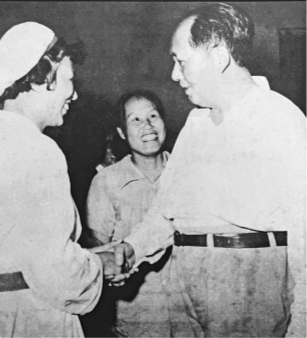 1958年9月14日,毛主席在接见武汉市妇女代表时,与邱益英(左)握手。