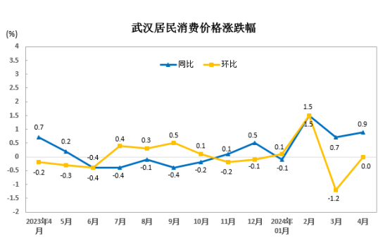 据悉,4月份,武汉市居民消费价格环比持平。其中,食品价格下降1.0%,非食品价格上涨0.2%;消费品价格下降0.3%,服务价格上涨0.4%。