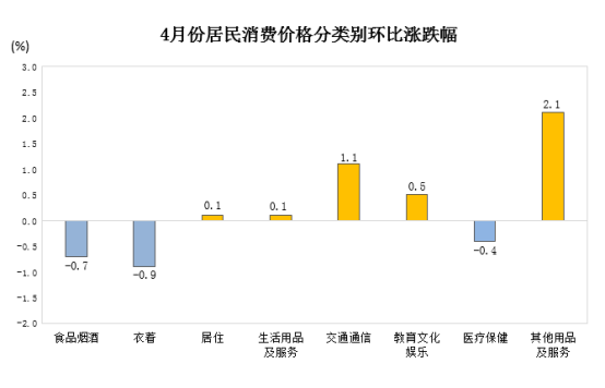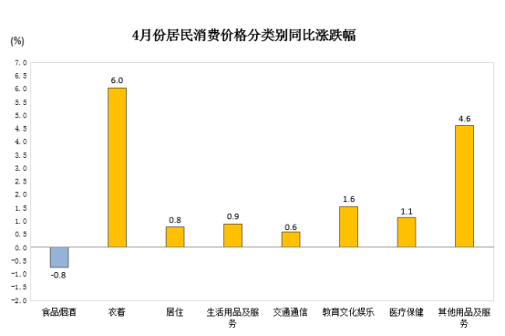 分类别看,4月份,食品烟酒类价格同比下降0.8%,衣着价格上涨6.0%,其他用品及服务价格上涨4.6%,教育文化娱乐价格上涨1.6%,医疗保健价格上涨1.1%,生活用品及服务价格上涨0.9%,居住价格上涨0.8%,交通通信价格上涨0.6%。