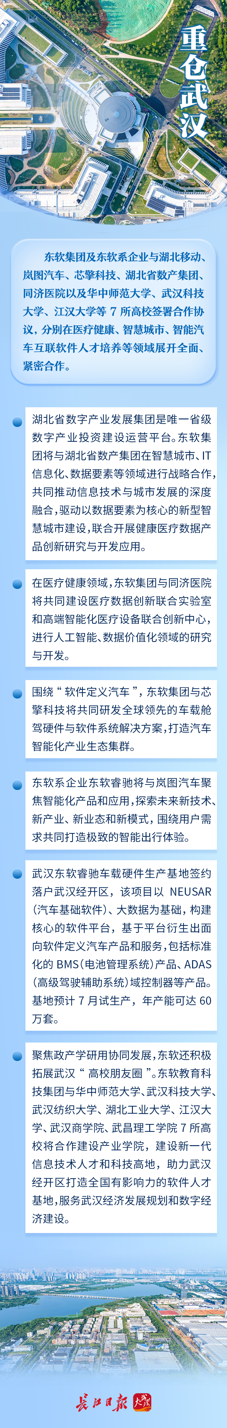 25日现场,东软还与中国移动湖北公司、湖北数字产业集团、华中科技大学附属同济医院、湖北芯擎科技、武汉经开区管委会、岚图汽车科技,以及江汉大学等7所高校签署合作协议,分别在医疗健康、智慧城市、智能汽车互联、软件人才培养等领域展开全面、紧密合作。