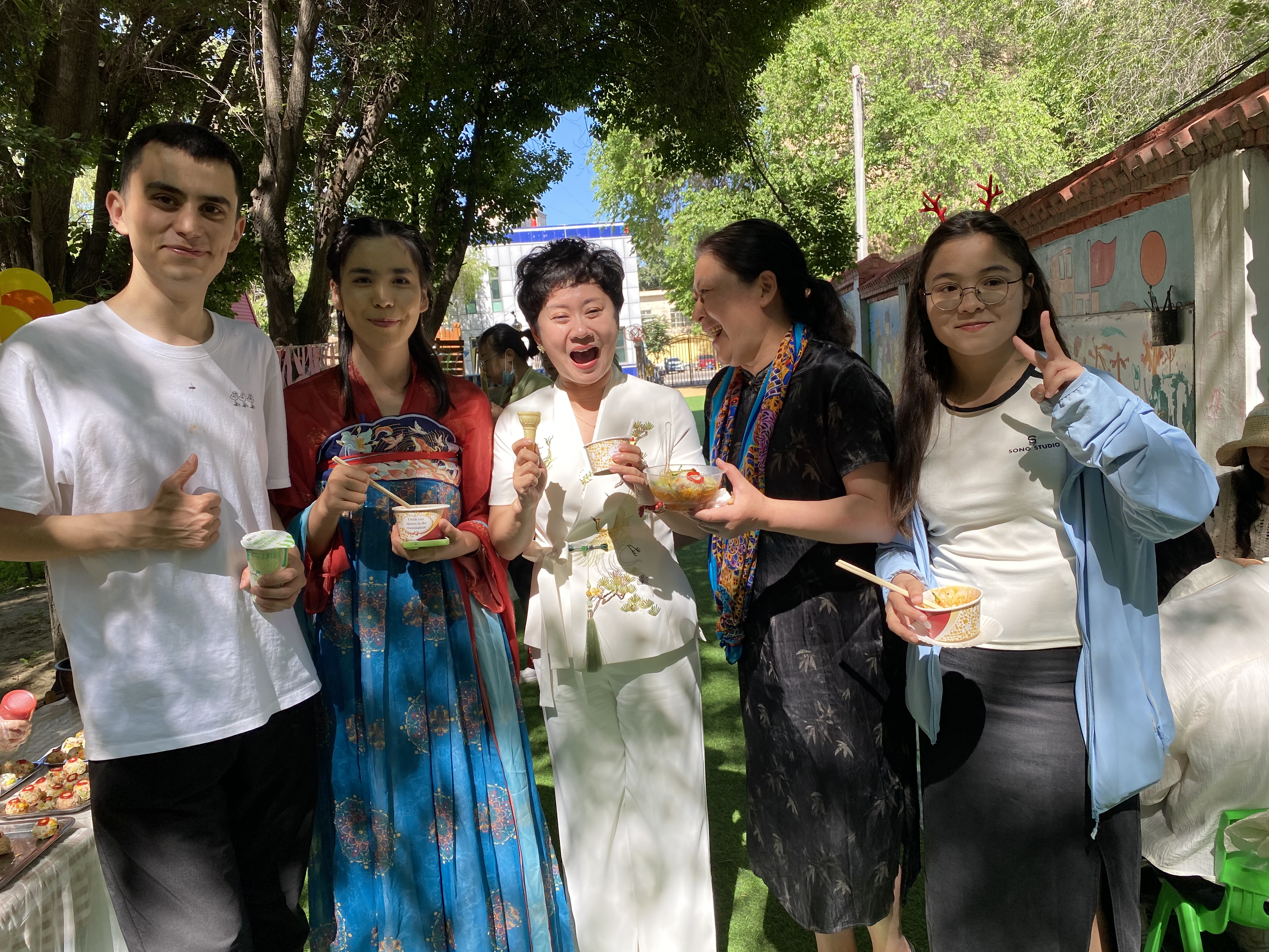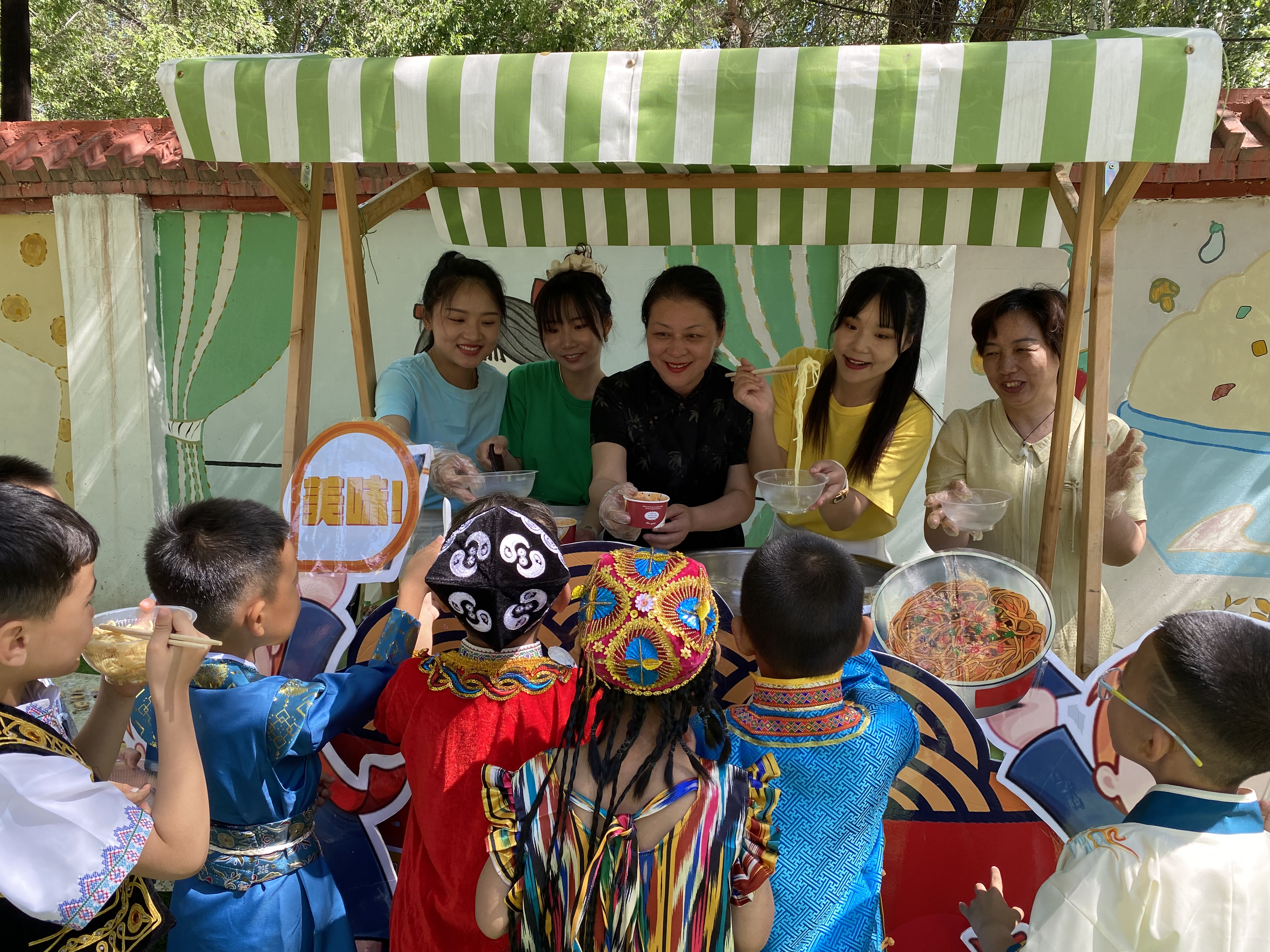 值得一提的是,五位湖北援疆教师严娅丽、夏瑾、冯梦琦、鲁佳俊、高颜琦一起做的热干面展台前,更是排起长队。拌上香喷喷芝麻酱的热干面,孩子们吃得津津有味。