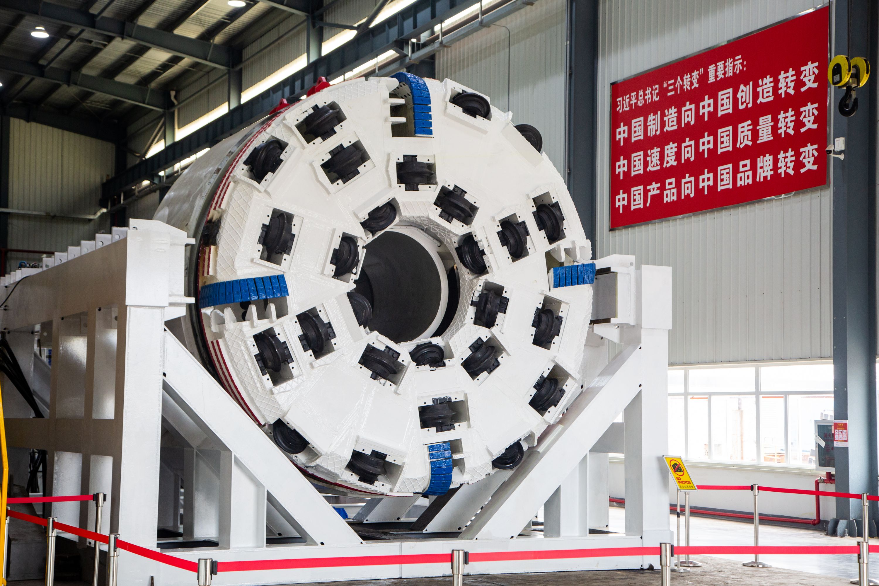 传统盾构机刀盘是一个“盾”,该设备刀盘中央有一直径1.2米的圆形空心。“长大隧道地质条件复杂多变,该设备可对不同岩层软硬通吃。”中铁科工江夏基地研发人员王承海介绍,超硬岩地质强度是常用混凝土的三至六倍,传统盾构机往往只能啃硬。掘爆机具有隧道掘进机安全高效和钻爆法施工灵活的优势,可借中央圆形通道装填炸药,经超前预裂处理,空心刀盘掘进效率可提升30%。