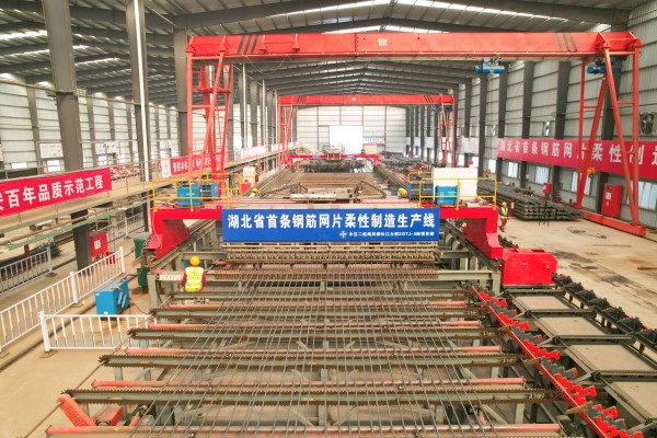 2023年6月,大桥进入主塔施工阶段,由中交二航局自主研发的最新一代一体化智能筑塔机投入使用,“钢筋网片柔性生产线”也被引入现场。这条生产线能把加工好的钢筋网片成品运输到工地直接焊接,从而大幅提升桥塔钢筋安装施工质量和生产效率。“像造汽车一样造大桥”得以实现。