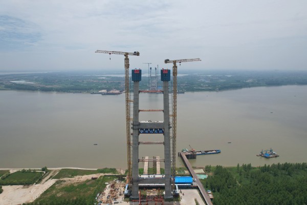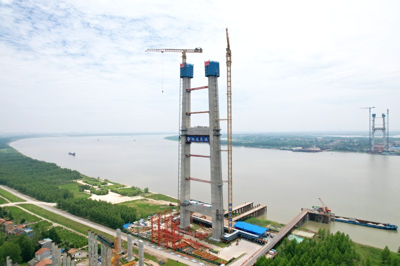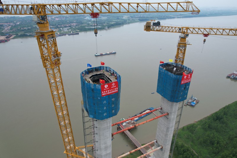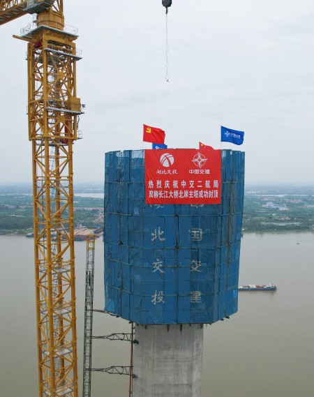 此次封顶的是双柳长江大桥北岸主塔,南岸主塔已在几天前完成封顶。