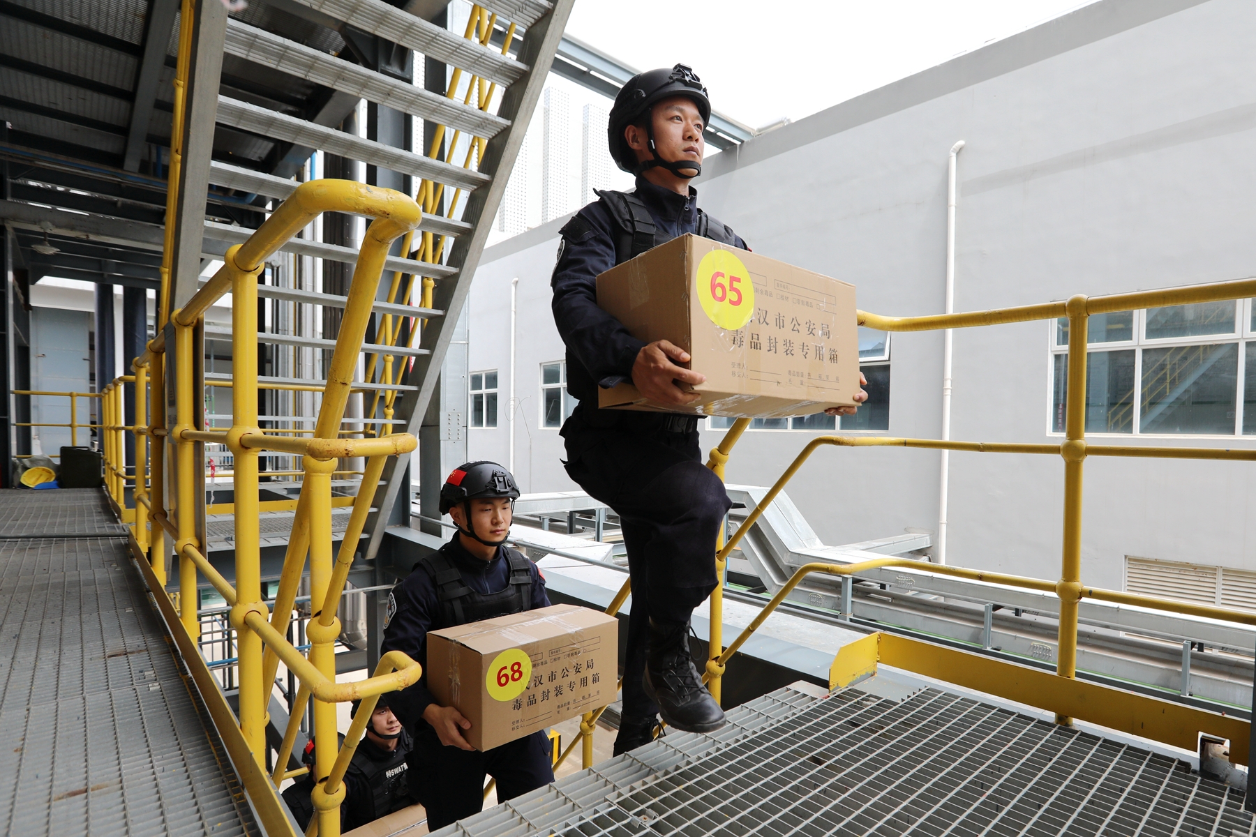 上午9时许,在蔡甸区某危化物品处理厂内,印有“毒品”字样的纸箱整齐摆放在热解炉前,里面装满了此次集中销毁的毒品,数名全副武装的特警在现场警戒。