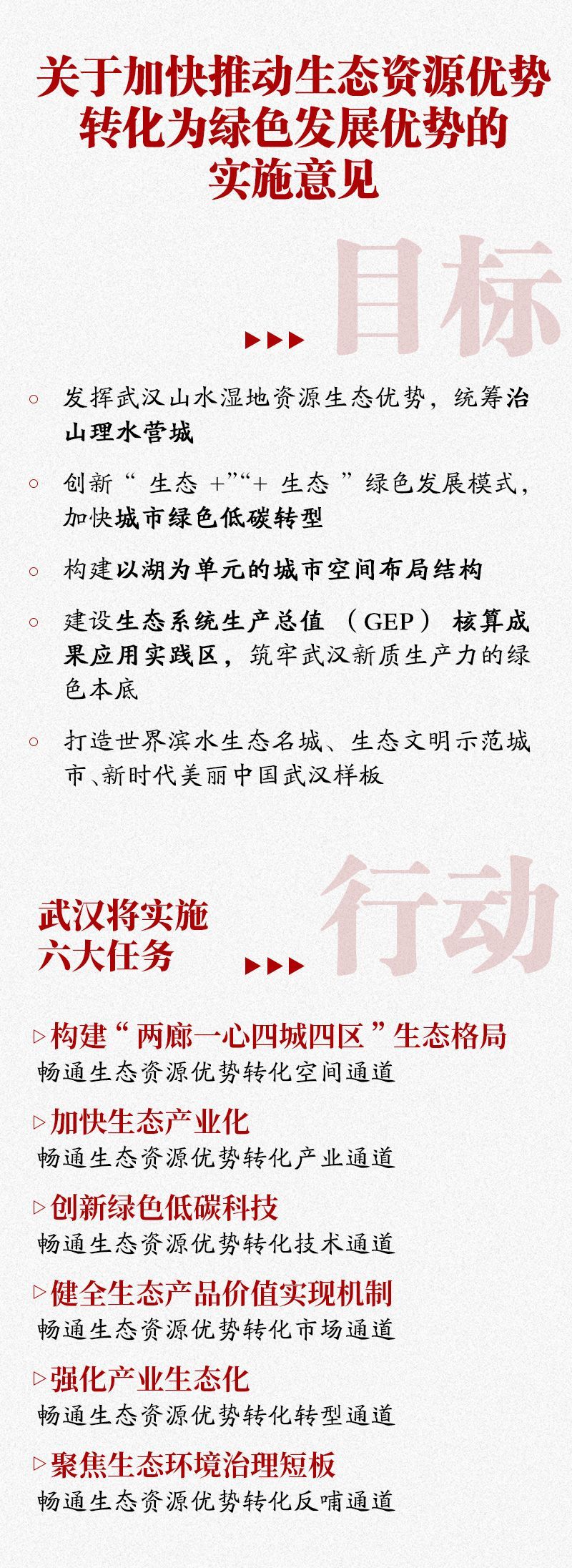 《关于加快推动生态资源优势转化为绿色发展优势的实施意见》提出,发挥武汉山水湿地资源生态优势,统筹治山理水营城,创新“生态+”“+生态”绿色发展模式,加快城市绿色低碳转型,构建以湖为单元的城市空间布局结构,建设生态系统生产总值(GEP)核算成果应用实践区,筑牢武汉新质生产力的绿色本底,打造世界滨水生态名城、生态文明示范城市、新时代美丽中国武汉样板。