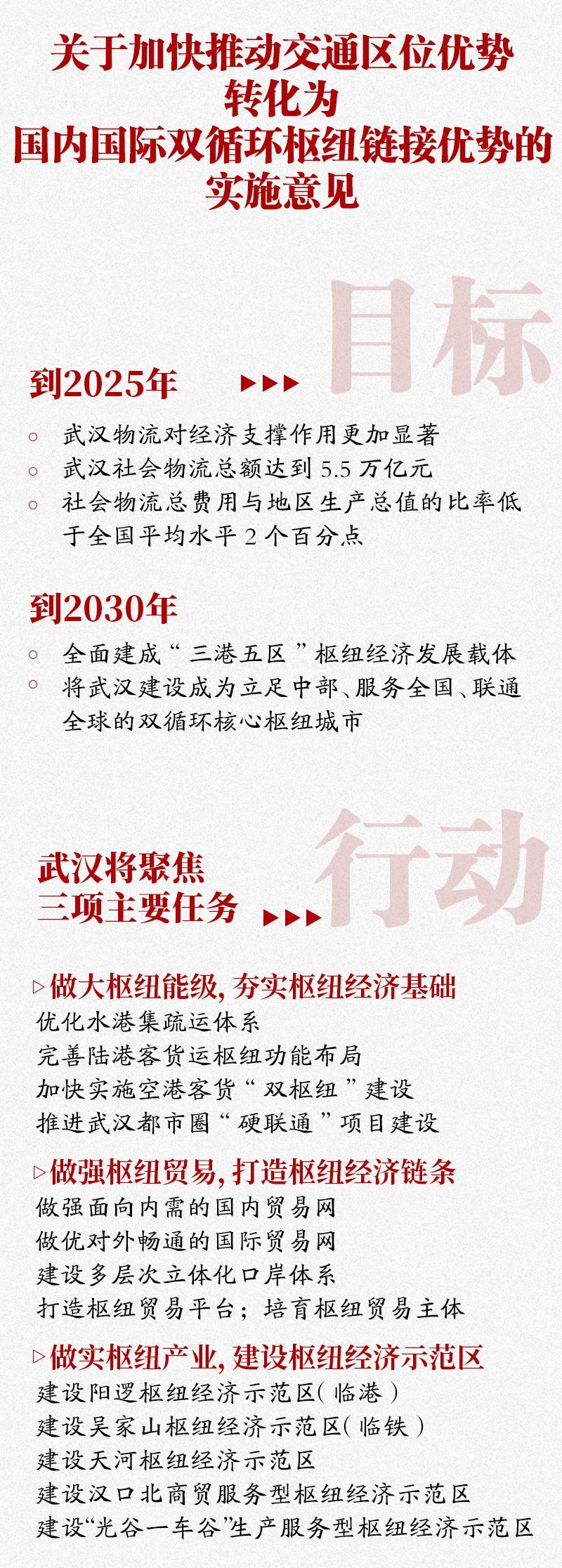 《关于加快推动交通区位优势转化为国内国际双循环枢纽链接优势的实施意见》明确提出,到2025年,武汉物流对经济支撑作用更加显著,社会物流总额达到5.5万亿元,社会物流总费用与地区生产总值的比率低于全国平均水平2个百分点;到2030年,全面建成“三港五区”枢纽经济发展载体,依托水陆空三个核心港,高水平建设临港、临铁、临空、商贸服务和生产服务五个枢纽经济示范区,将武汉建设成为立足中部、服务全国、联通全球的双循环核心枢纽城市。