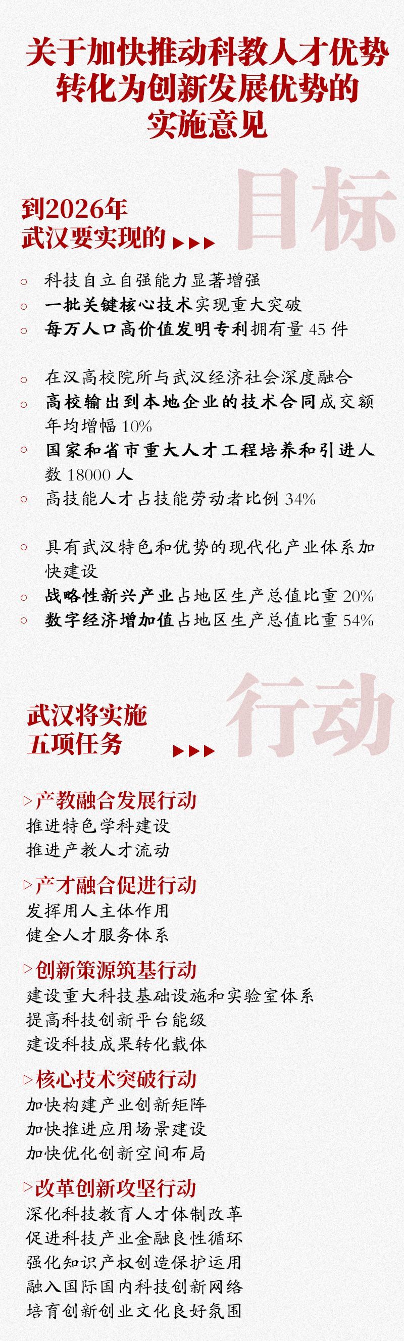 《关于加快推动科教人才优势转化为创新发展优势的实施意见》提出,到2026年,武汉科技自立自强能力显著增强,一批关键核心技术实现重大突破,每万人口高价值发明专利拥有量达到45件;在汉高校院所与武汉经济社会深度融合,高校输出到本地企业的技术合同成交额年均增幅10%,国家和省市重大人才工程培养和引进人数达到18000人,高技能人才占技能劳动者比例达到34%;具有武汉特色和优势的现代化产业体系加快建设,战略性新兴产业和数字经济增加值占地区生产总值比重分别达到20%和54%。