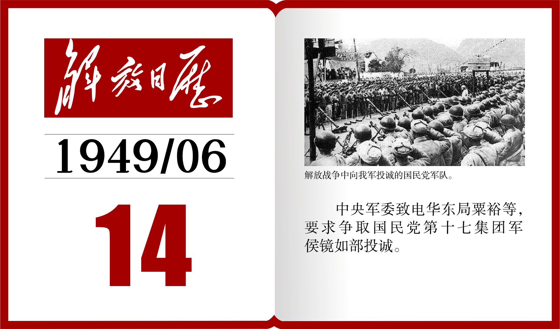 1949年的今天,中央军委致电华东局粟裕等,要求争取国民党第十七集团军侯镜如部投诚︱解放日历 ©原创 2024-06-14 20:18 0 (整理:张颖 制作:张莉 图片来源:学习强国) 【编辑:王戎飞】