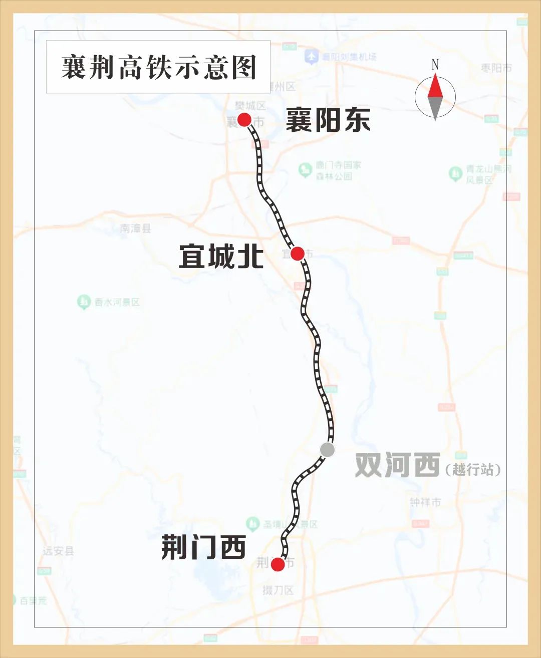 襄荆高铁全线长约116公里,设计时速为350公里,是我国“八纵八横”高速铁路主通道之一,也是呼南通道的重要组成部分。襄荆高铁全线设襄阳东、宜城北、双河西、荆门西4座车站,其中襄阳东为既有车站,荆门西、宜城北、双河西3座车站为新建车站,双河西为越行站,暂不办理客运业务。襄荆高铁建成通车后,襄阳和荆门间将实现半小时通达。