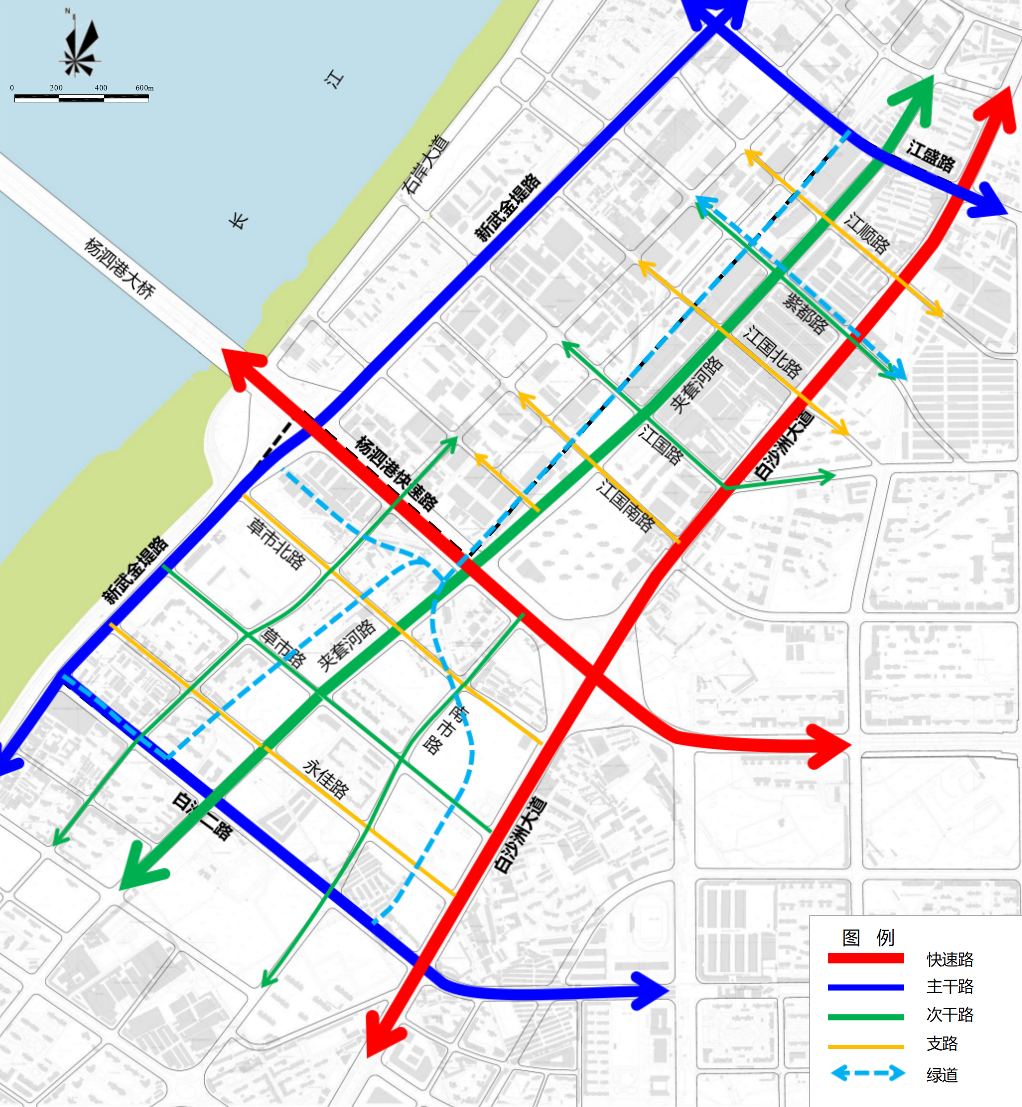 在实施方案中,明确了道路基础设施改造方向,未来将形成以“三横三纵”(三横:江盛路、杨泗港快速路、白沙二路。三纵:新武金堤路、夹套河路、白沙洲大道)为骨架的片区路网,随路建设信号灯、电子监控、交通诱导等智能交通系统,改善片区内部微循环路网贯通性差、断头路多且不成体系的现状。