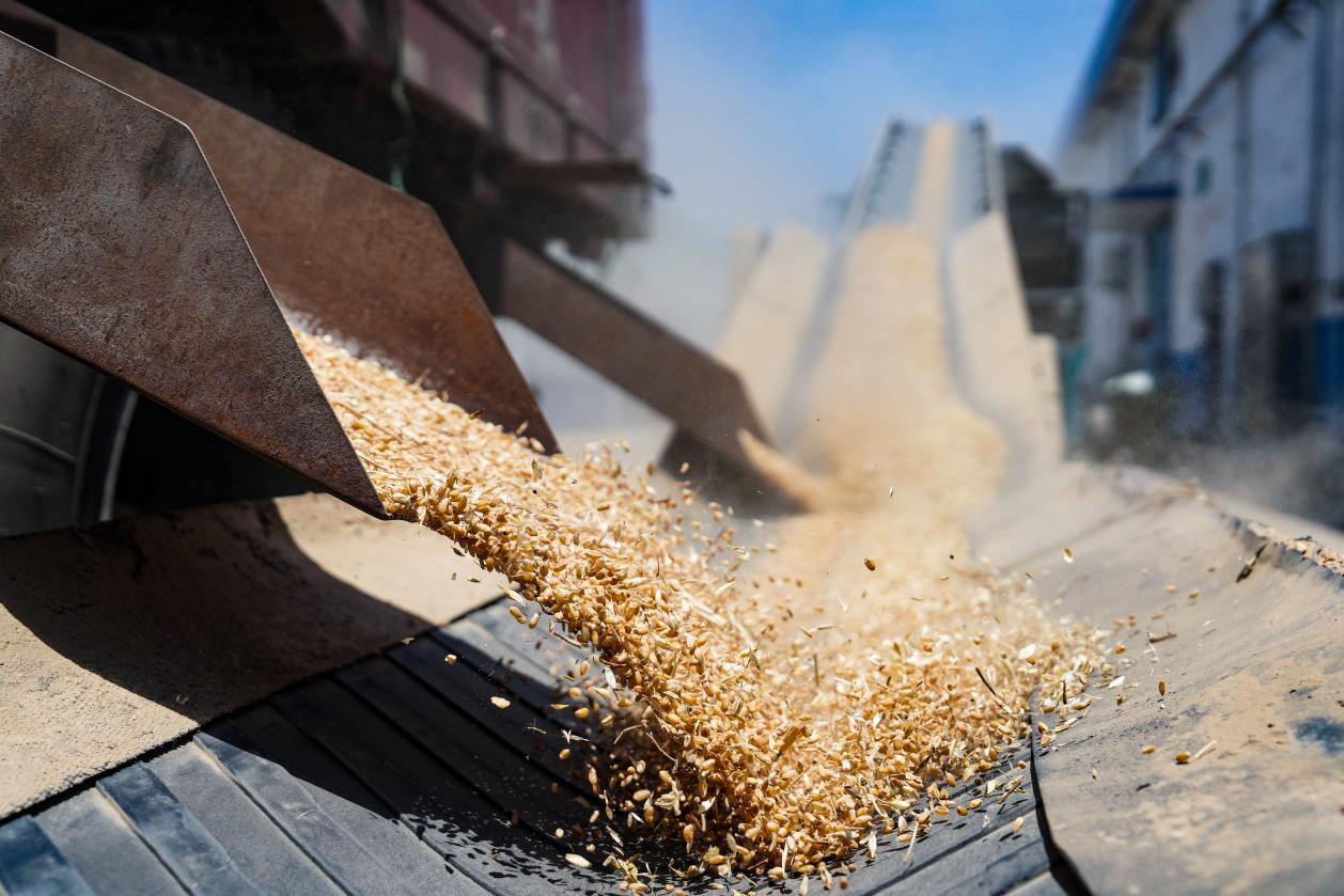 新鲜的小麦正在通过传送带和振筛机入库。