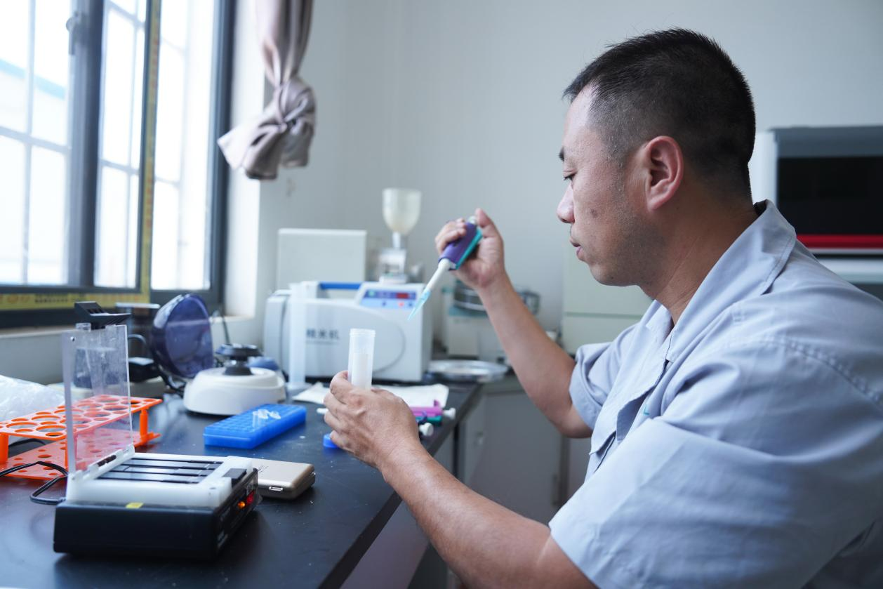 粮库质检员正在对新鲜的粮食进行检查。