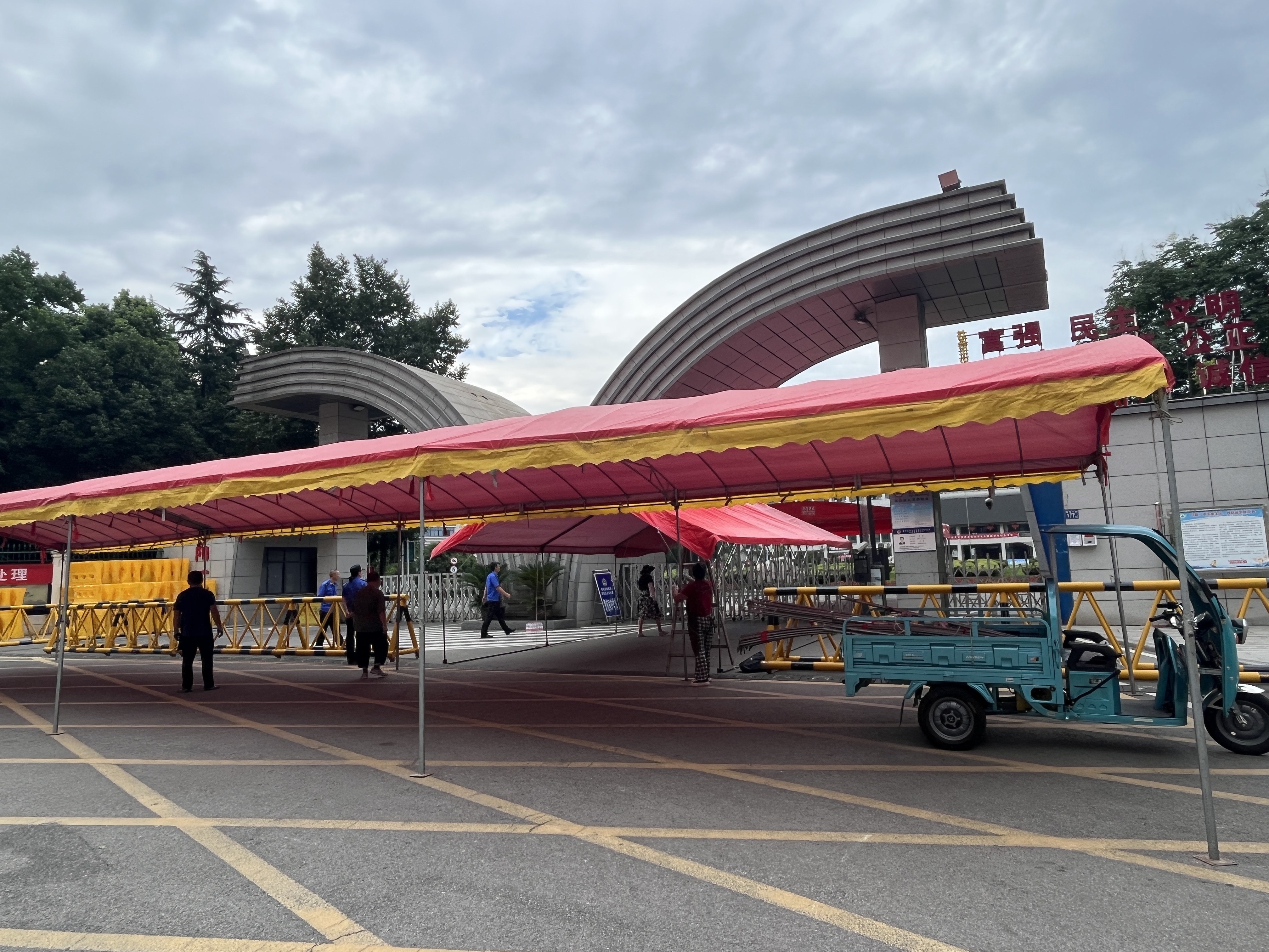 在蔡甸区汉阳一中、蔡甸职教中心、蔡甸区实验小学3处考点,执法队员连夜加班搭建3800余平方米的遮雨棚。目前,搭建工作还在紧张地进行中。与此同时,区城管执法督察大队还加强了考点的市容秩序和噪声扰民治理措施,为考生提供休息区域,设置交通引导牌,确保考生顺利到达考场,保障考生和家长的安全。