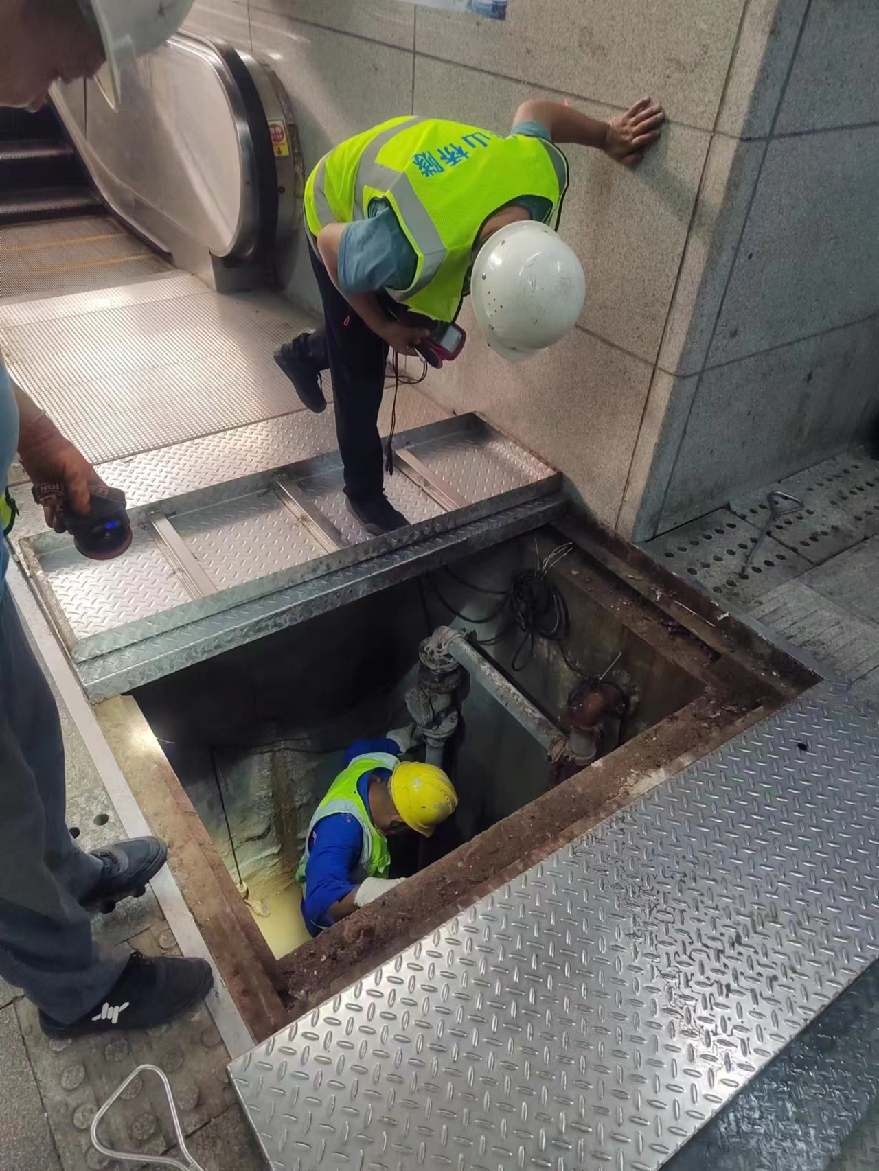19日上午,雄楚大道楚平路人行通道,洪山区城管执法局市政维护管理中心工作人员正在对通道内的排水孔(管、沟)、电梯井进行安全检查和杂物清理。