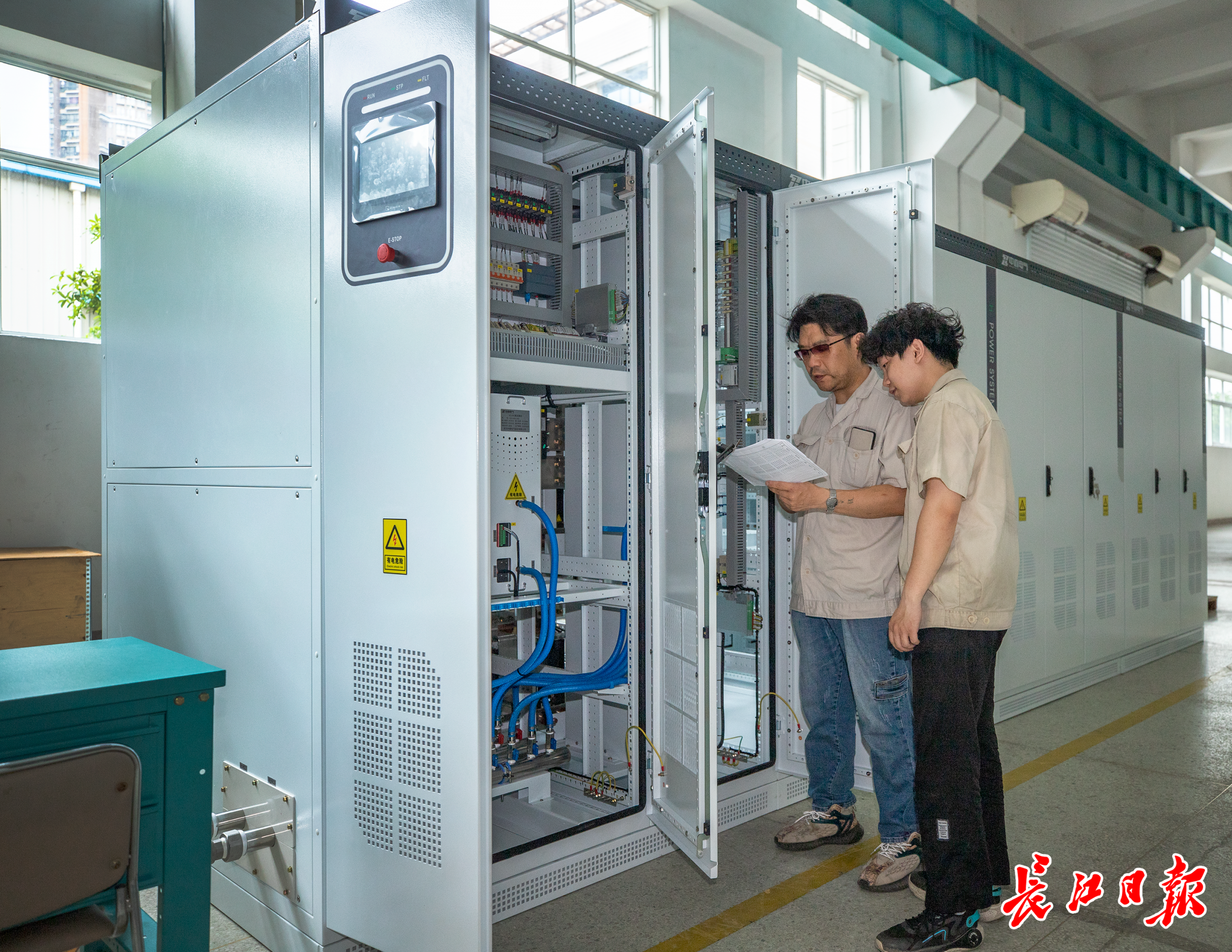 长江日报记者在长兴集团生产车间看到,这是一台长6米、深1.4米、高2.2米的外形如“大铁柜”的设备。工作人员正对其进行量产前的调试。这位工作人员介绍,这只“大铁柜”就是制氢电源,它可将风力发电机和光伏板发出的交流电,转换成制氢所需的直流电。