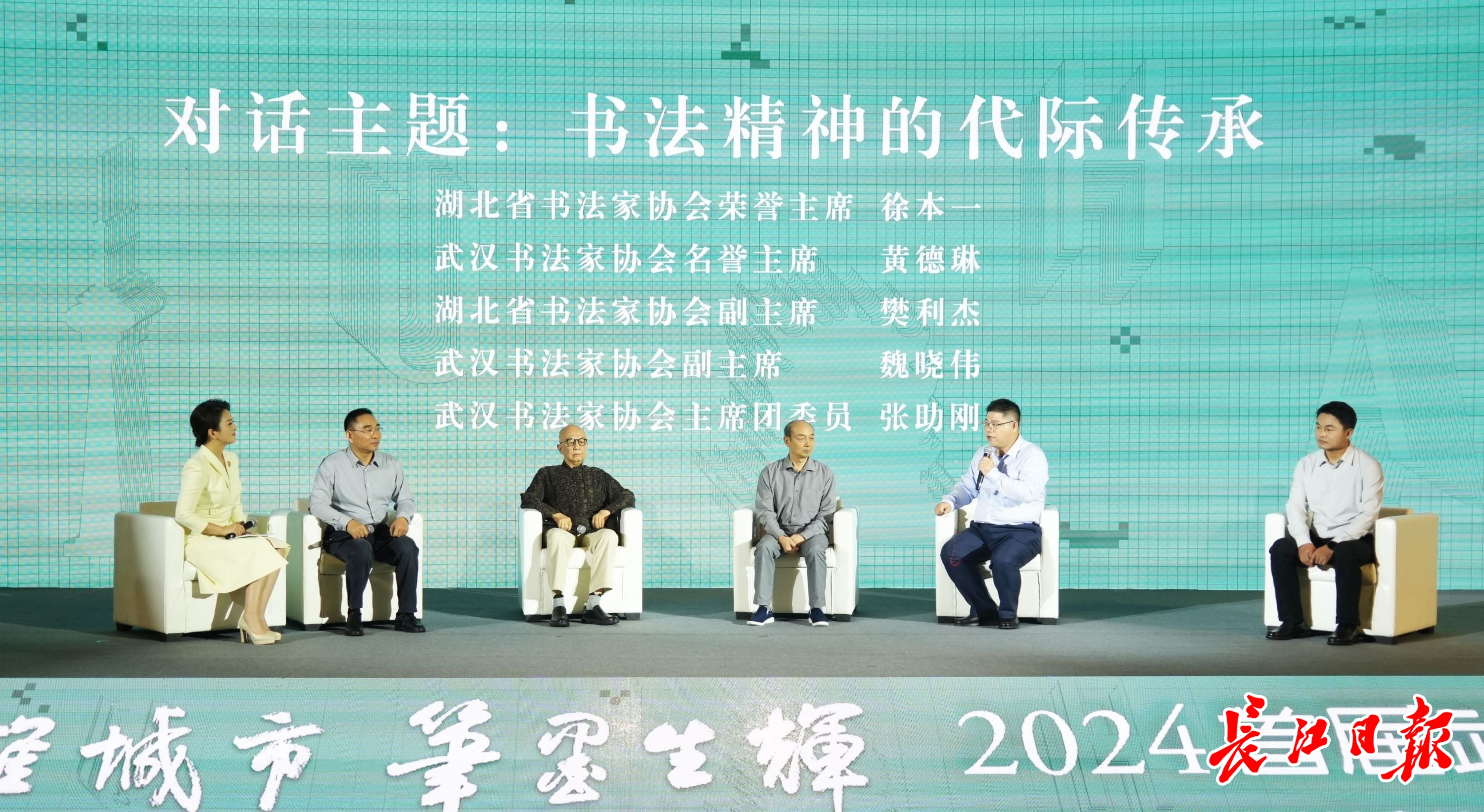 人文荟萃的武汉,不仅是历史上著名的书法名城,也是近代以来中国书法历史流变的重要阵地。这一切,都离不开一代又一代武汉书法家的接续奋斗。在6月24日举行的2024首届武汉书法季开幕式上,徐本一、黄德琳、樊利杰、魏晓伟和张助刚五位本土书法家齐聚对话环节,以自身学习、创作经历共论“书法精神的代际传承”。在他们的讲述中,浩荡的长江,高耸的黄鹤楼给了他们无穷的灵感,而一代又一代书家接力传承,令现场听者为之动容。