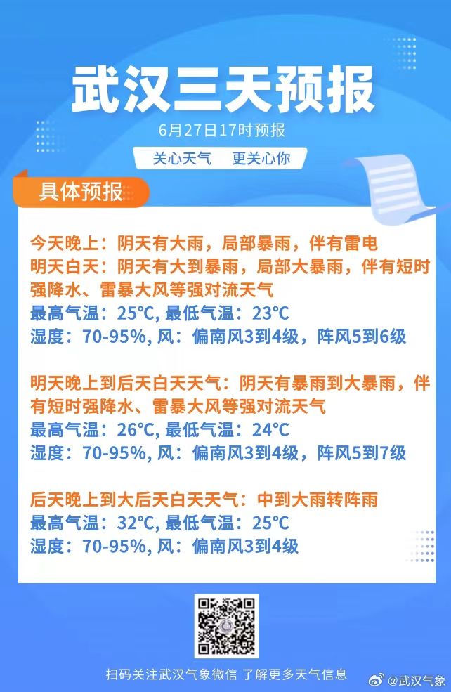 长江日报大武汉客户端6月27日讯(记者夏奕 通讯员韩俊)据气象部门预计,未来几天武汉市有强降雨天气,27日晚至29日全市将迎来新一轮大到暴雨天气过程,并伴有短时强降水,雷暴大风等强对流天气,6月30日至7月3日武汉还将有较明显降水。27日21时,武汉交警发布提醒:请市民密切关注天气变化,合理规划行程,注意交通安全。