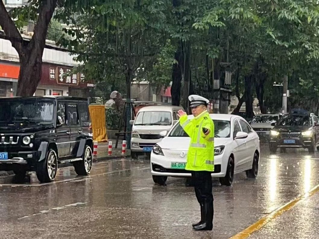 武汉交警雨中维护交通秩序。 通讯员韩俊 供图(资料图)