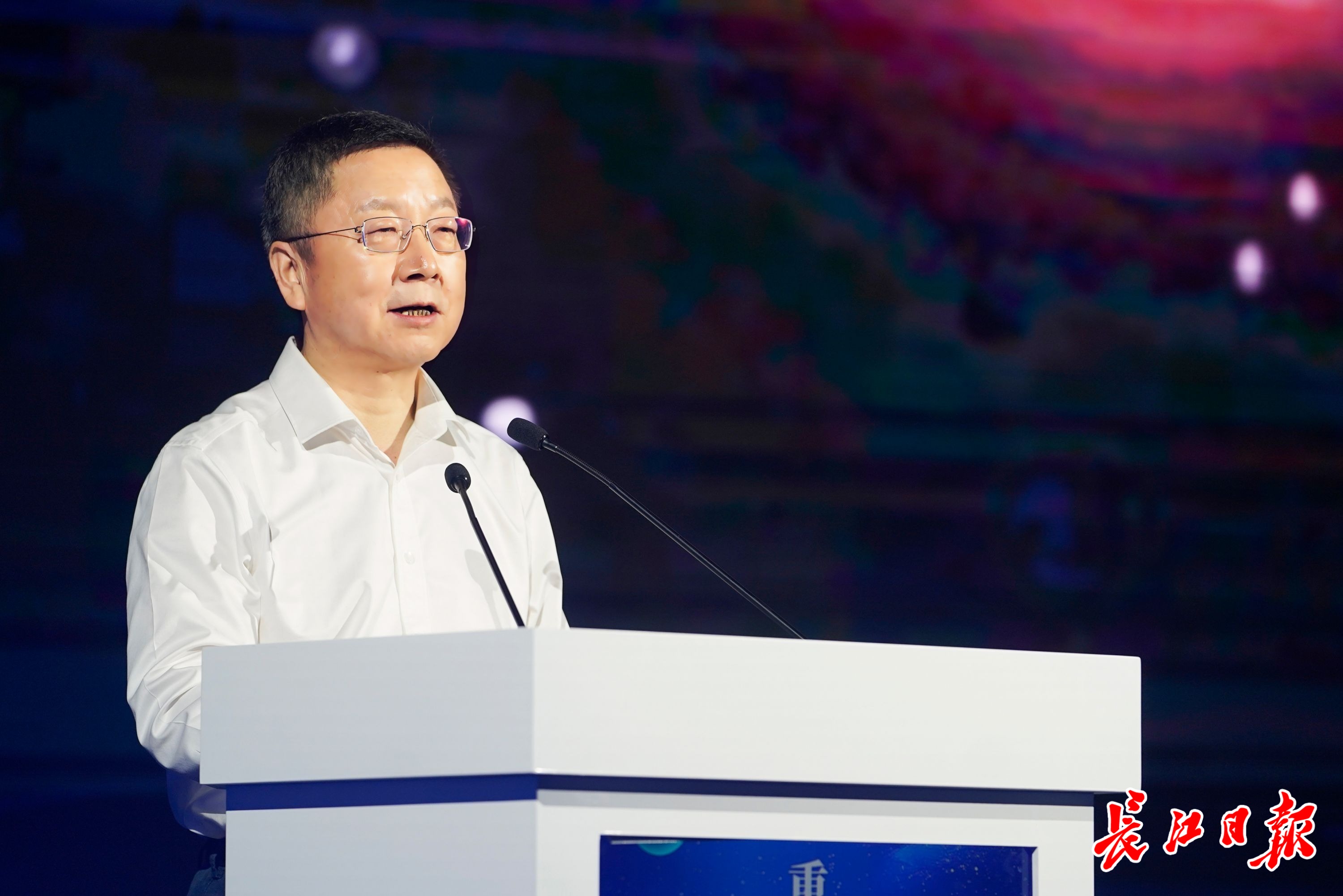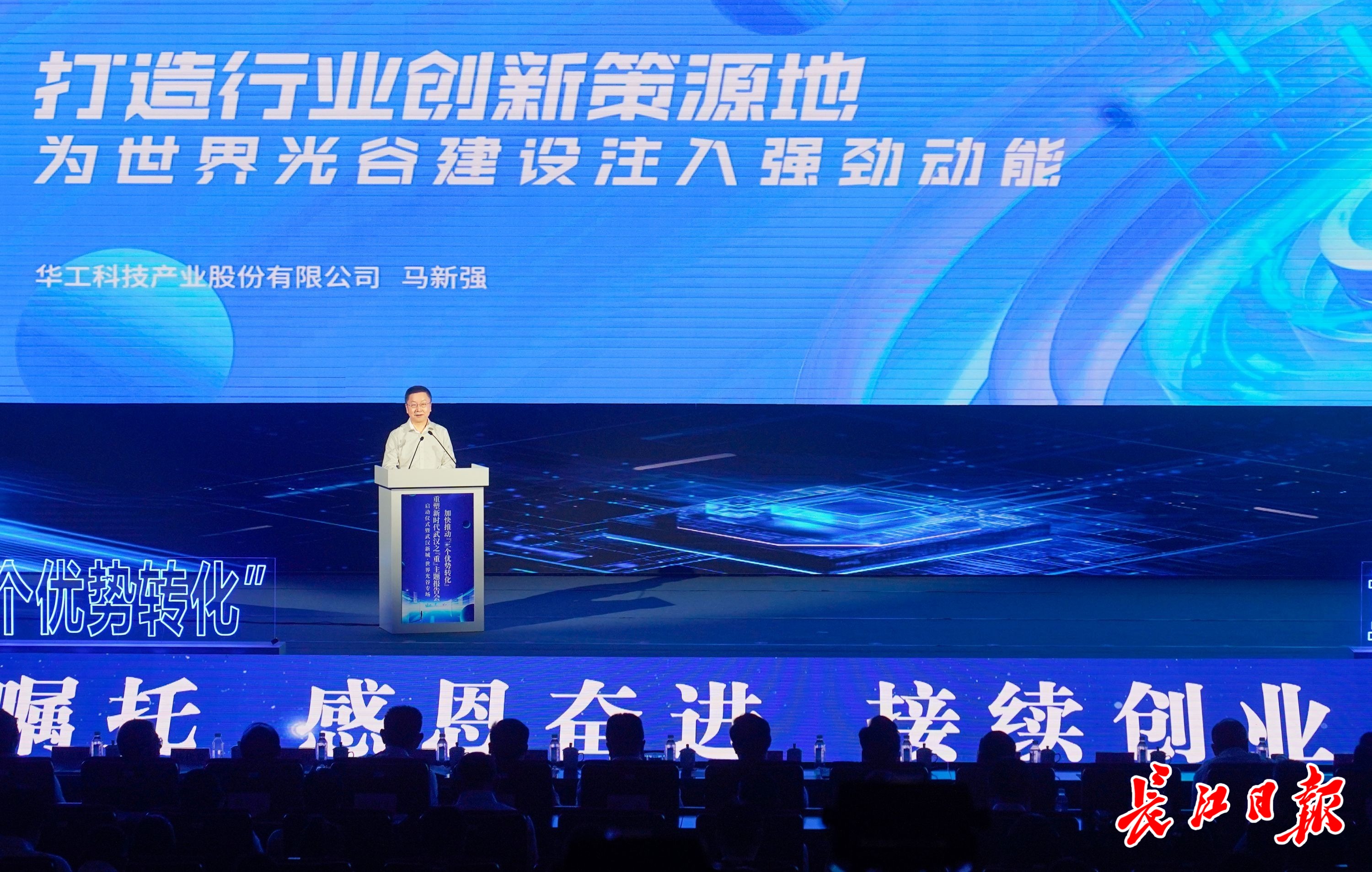 6月27日,“加快推动‘三个优势转化’,重塑新时代武汉之‘重’”主题报告会之“武汉新城·世界光谷”专场上,华工科技党委书记、董事长马新强作报告。记者彭年 摄
