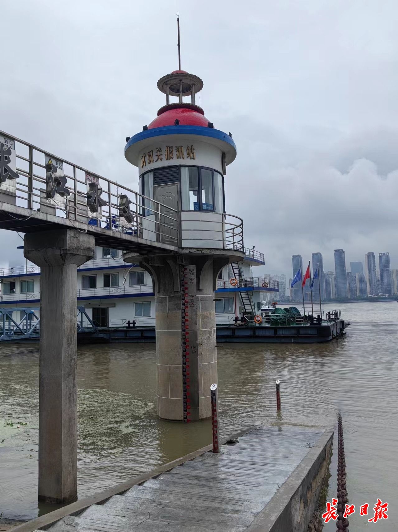 长江汉口站,上涨的江水不断“吞噬”水位标线。记者金文兵 摄