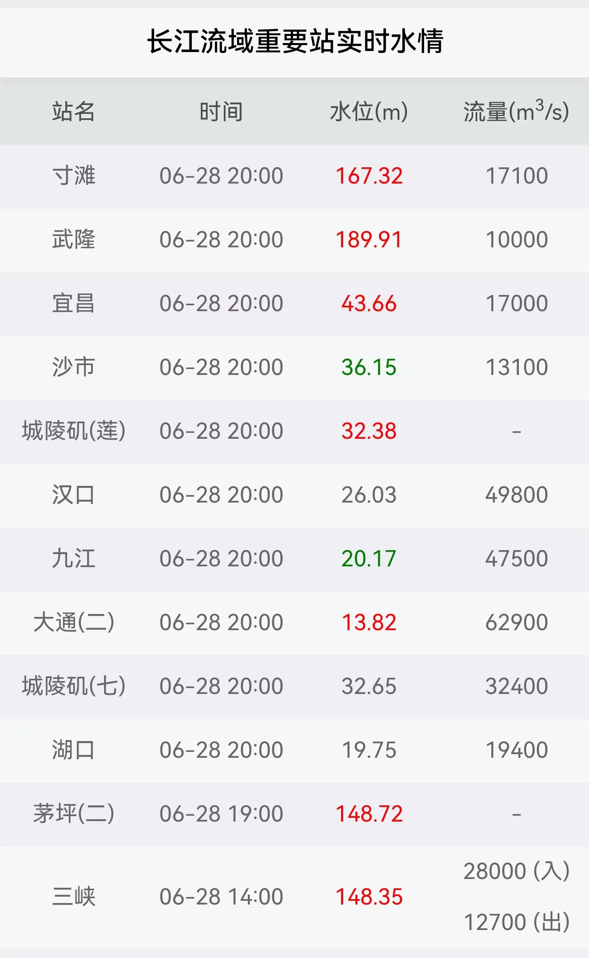 6月28日20时,长江汉口站水位超过设防水位1米多,达到26.03米。。预计汉口站水位29日26.39米,30日27.01米,7月1日27.01米,2日27.04米,3日27.08米。