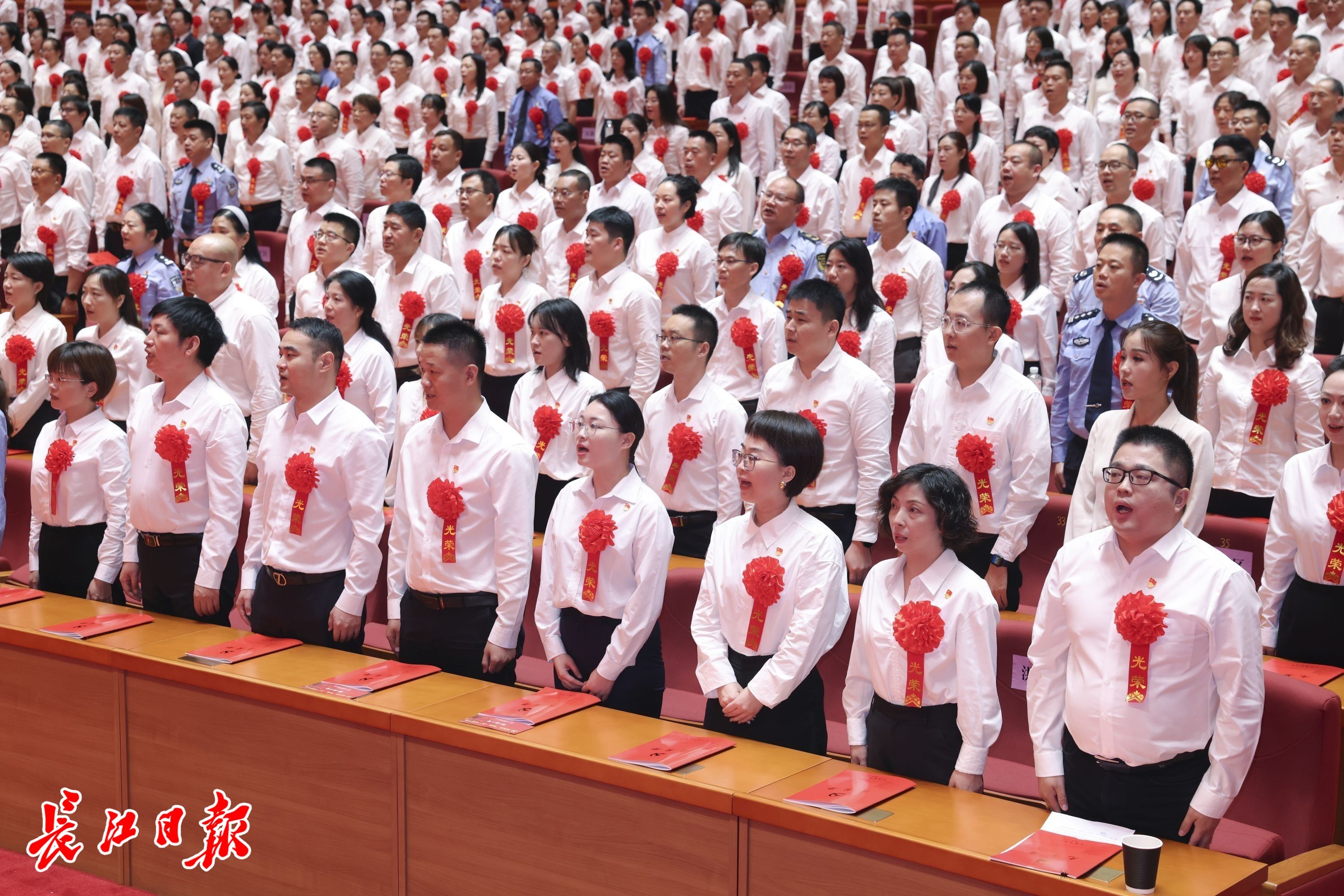 6月28日,武汉市“两优一先”表彰大会举行。图为大会现场,齐唱国歌。
