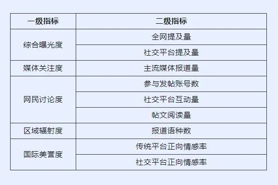 中国城市国际传播影响力指标下设一级指标5个,二级指标9个,从海外综合曝光度、媒体关注度、网民讨论度、区域辐射度以及国际美誉度等多个维度,全面评价了中国城市的国际传播影响力。