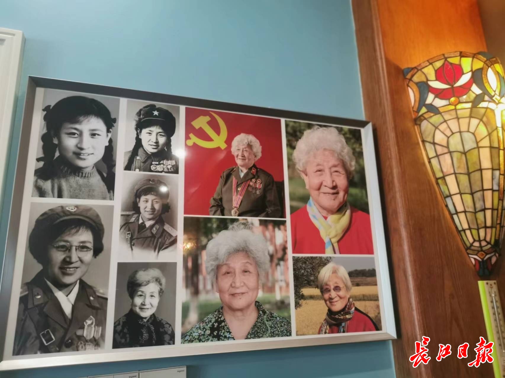 老人把一生不同时期的照片浓缩进相框,挂在家里,正中那张是她晚年在党旗下佩带军功章的照片。 记者刘睿彻 摄